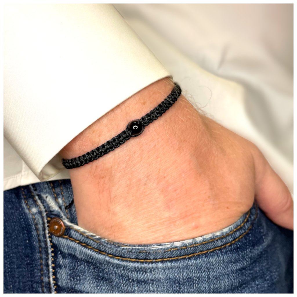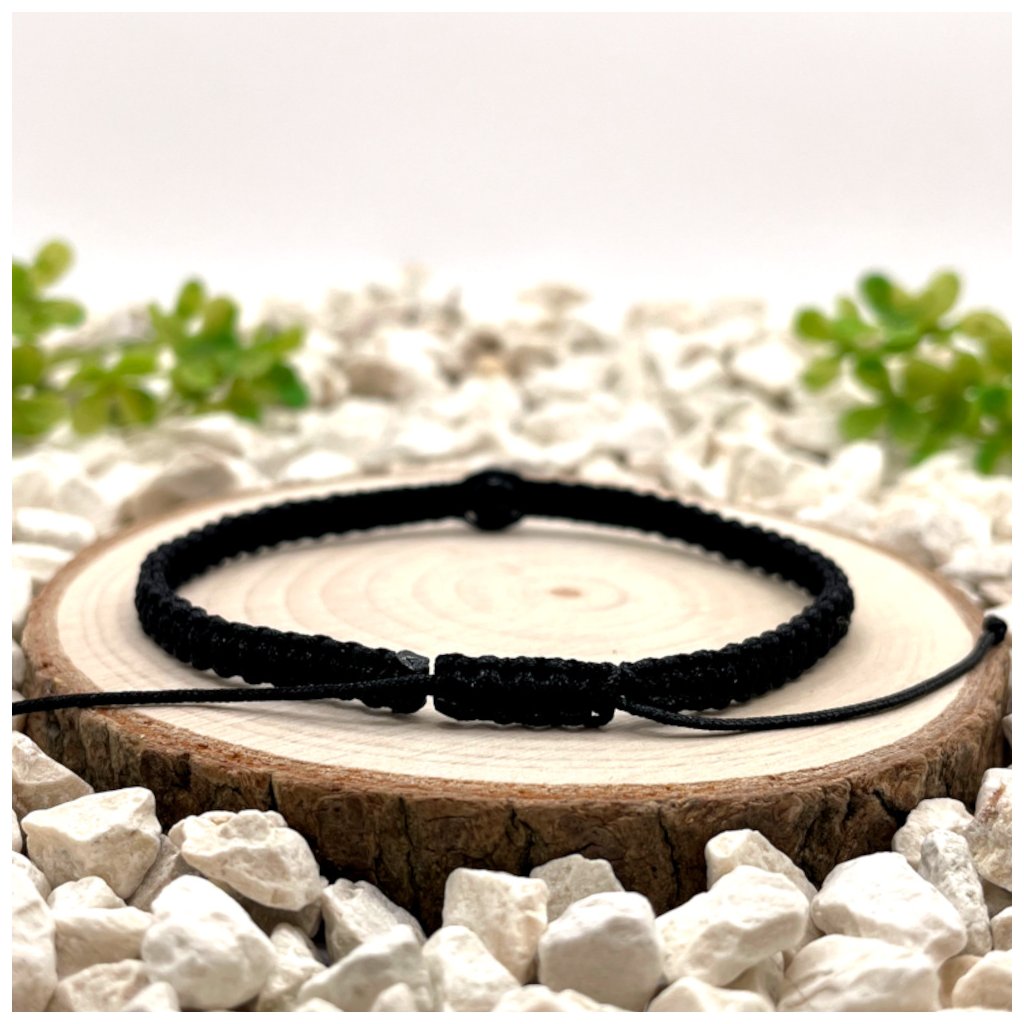 Tento ručně vyráběný macramé náramek je tvořen z černého nylonového provázku a doplněn o černý Obsidián (6 mm). Díky posuvnému uzlu je možné nastavit délku od 17 do 25 cm, takže náramek pohodlně sedí na každém zápěstí.