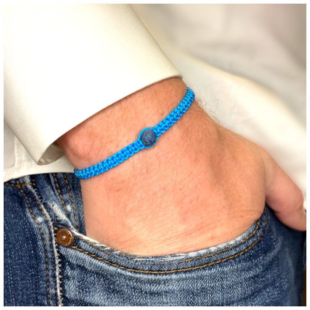Tento ručně pletený macramé náramek s Lapis Lazuli (6 mm) kombinuje jemnost textilního provázku s výrazným odstínem modrého kamene. Náramek je vyroben z modrého nylonu a díky posuvnému uzlu jej lze snadno přizpůsobit zápěstí v rozmezí 16–24 cm.
