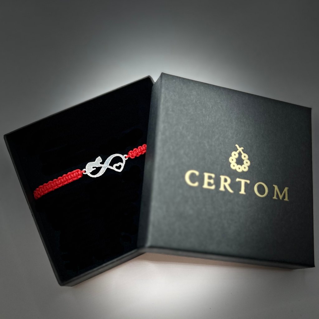 Macramé náramek s přívěskem nekonečna s motivem kočky kombinuje minimalistický tvar s detailním zpracováním. Stříbrný přívěsek z ryzího stříbra Ag925 je zasazen do červené nylonové šňůrky, která zvýrazňuje jeho linie a dodává celku živý, ale vyvážený vzhled.