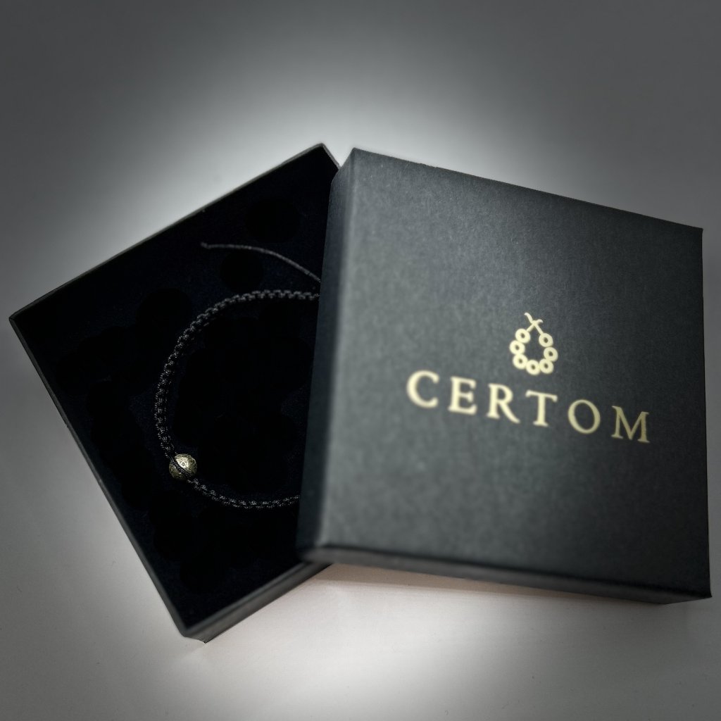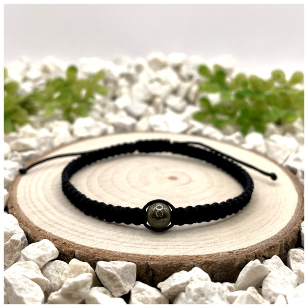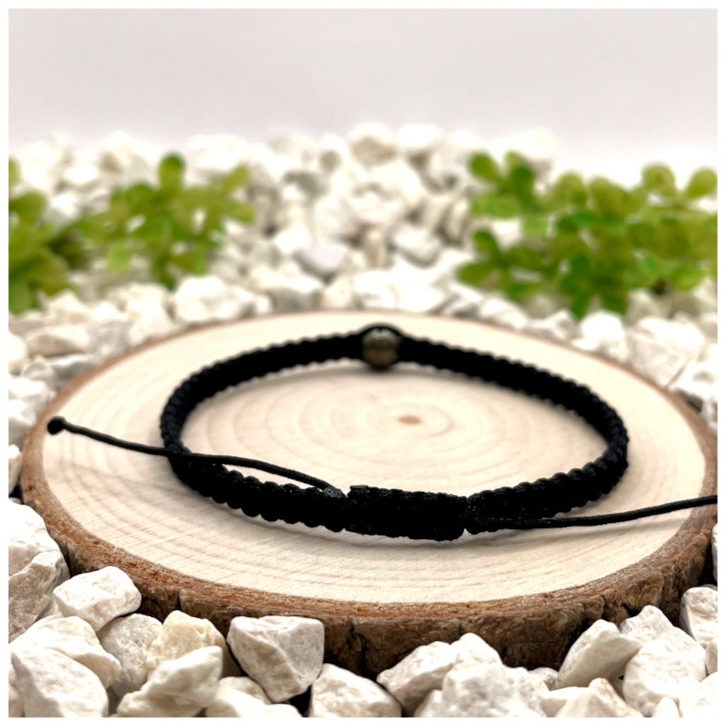 Tento macramé náramek s pyritem je tvořen korálky o velikosti 6 mm, které jsou ručně zapleteny černou nylonovou šňůrkou. Kombinace tmavého výpletu a typického kovového lesku pyritu vytváří výrazný, ale stále nadčasový doplněk.