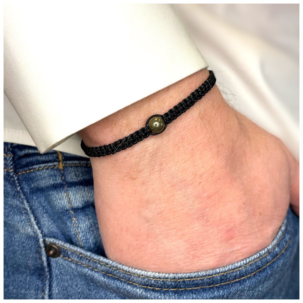 Černá nylonová šňůrka se snadno kombinuje s minimalistickými i sportovně laděnými outfity. Náramek lze nosit samostatně jako dominantní detail nebo jej vrstvit s dalšími macramé či minerálními náramky pro výraznější efekt.