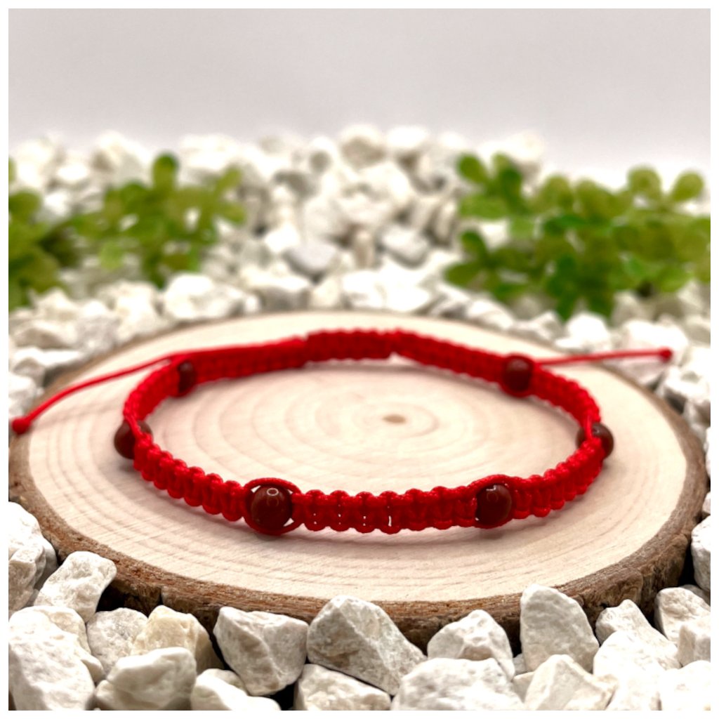 Macramé náramek s červeným jaspisem je tvořen drobnými korálky o velikosti 4 mm, které jsou ručně zapleteny do červené nylonové šňůrky. Výrazný odstín šňůrky v kombinaci s přirozenou kresbou minerálu vytváří osobitý doplněk inspirovaný přírodními materiály a jednoduchým designem.