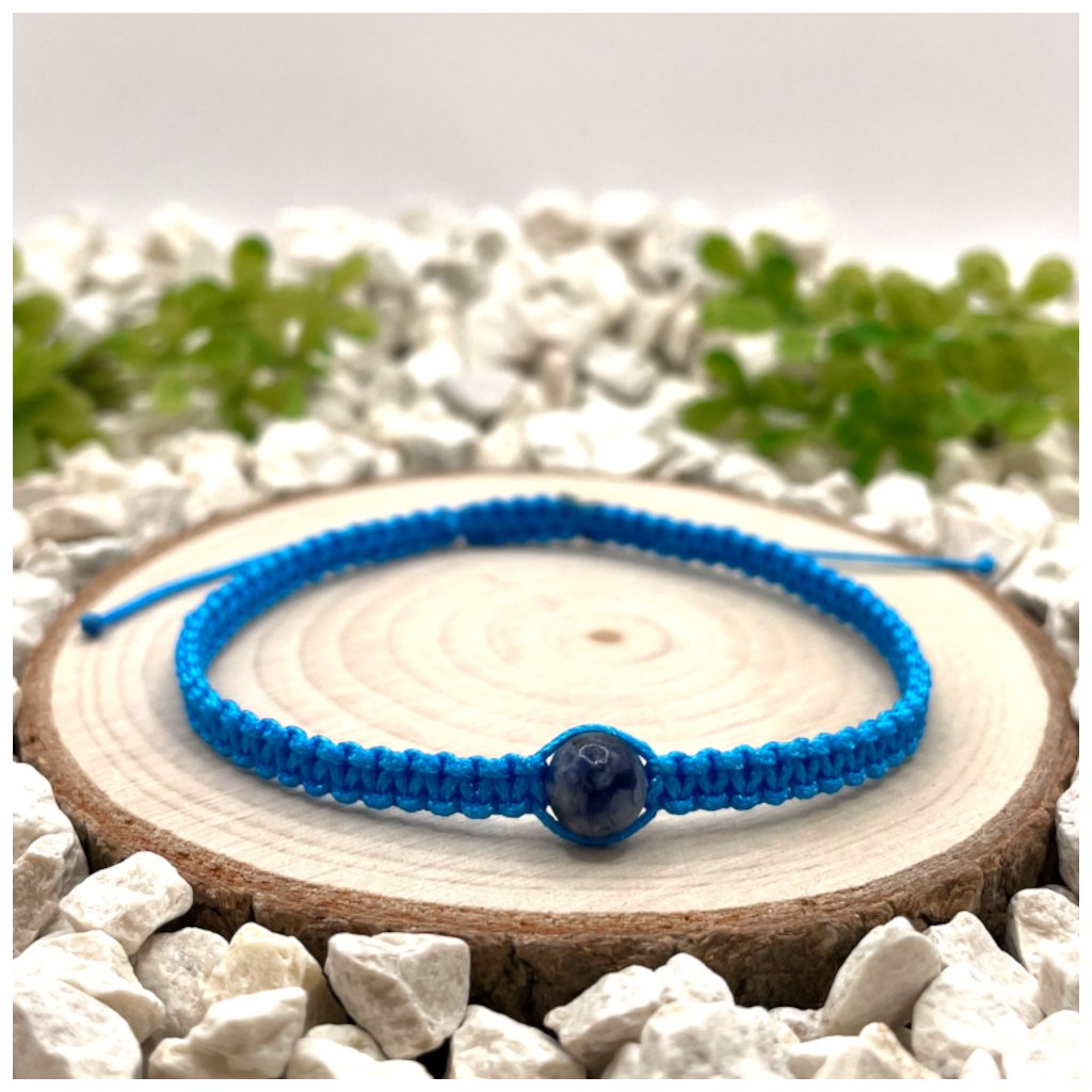 Tento macramé pletený náramek je tvořen korálky sodalitu o velikosti 6 mm, které jsou zasazeny do modré nylonové šňůrky. Díky posuvnému uzlu nabízí pohodlné nastavení délky v rozmezí 17,5–25,5 cm, což umožňuje snadné přizpůsobení různým velikostem zápěstí.