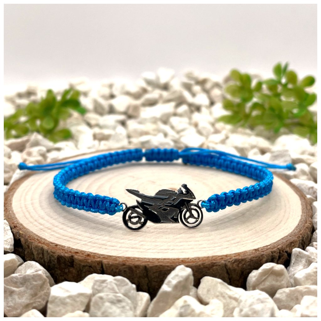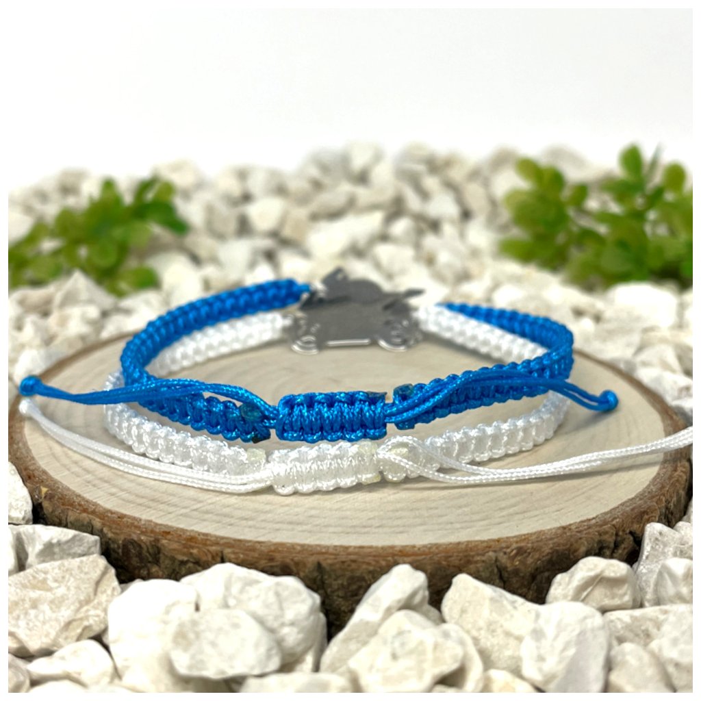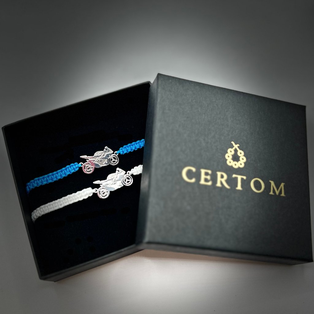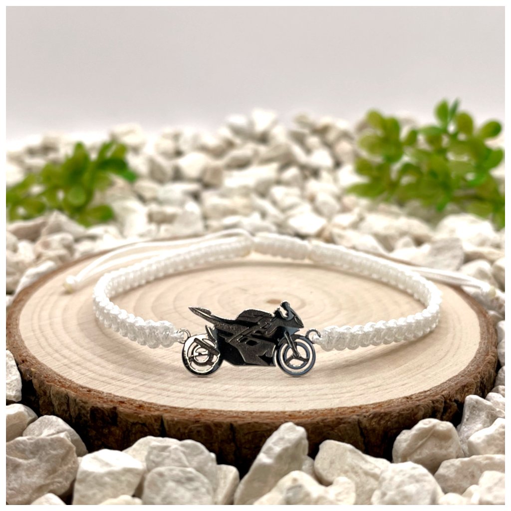 Párové macramé náramky s motivem motorky zaujmou dynamickým designem a jasným vizuálním sdělením. Stříbrné přívěsky z ryzího stříbra Ag925 jsou zasazeny do bílé a světle modré nylonové šňůrky, která působí lehce a moderně. Celek vytváří výrazný, přesto vyvážený doplněk pro každodenní nošení.