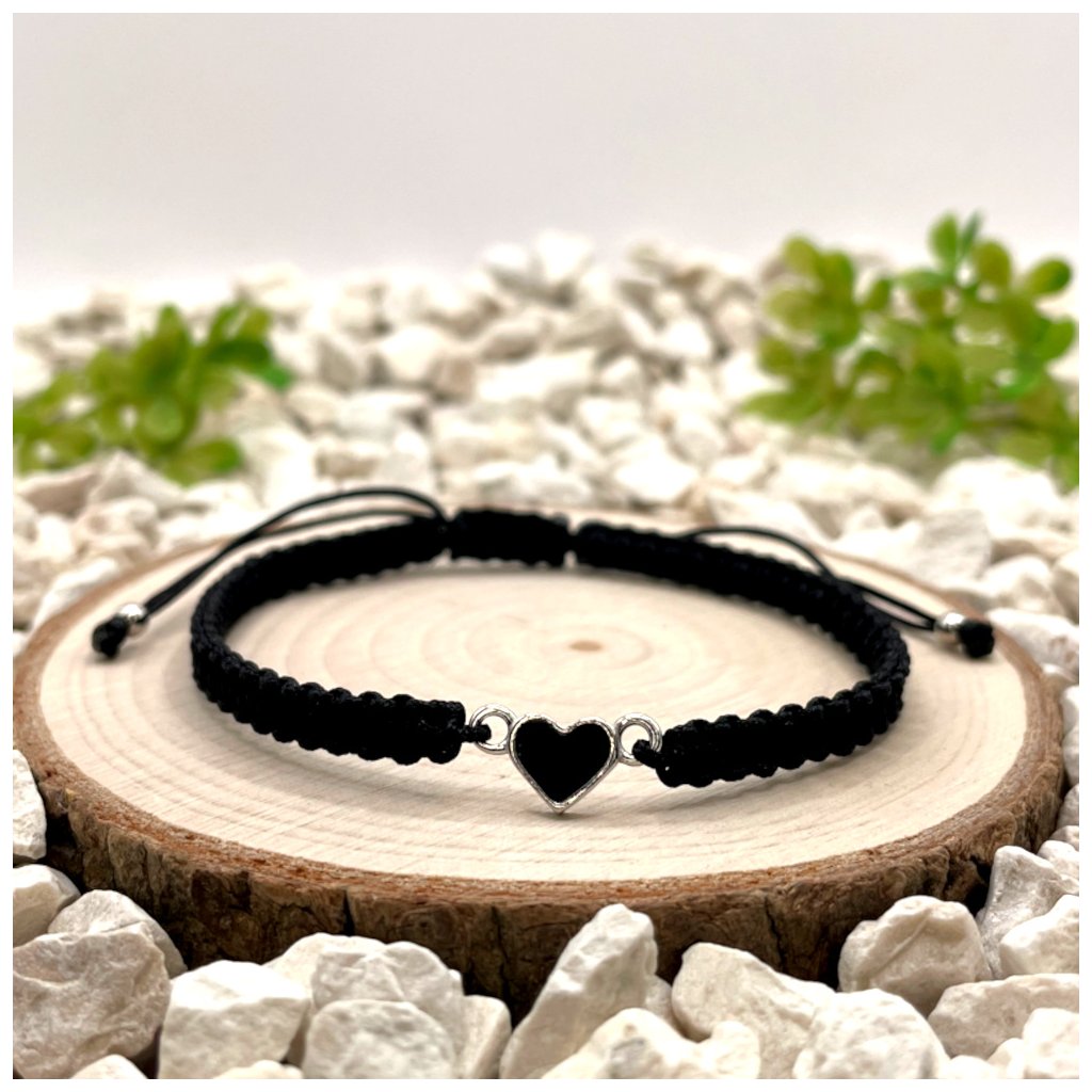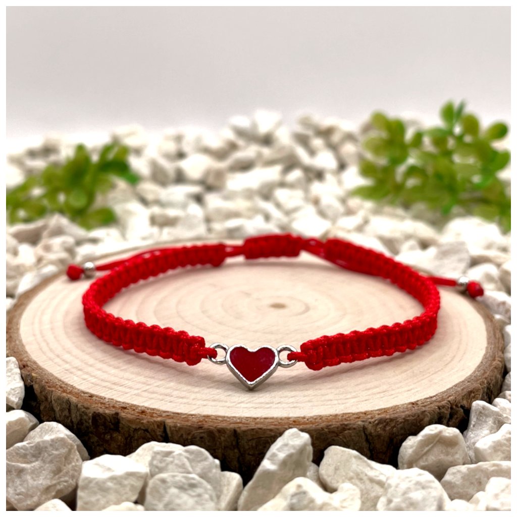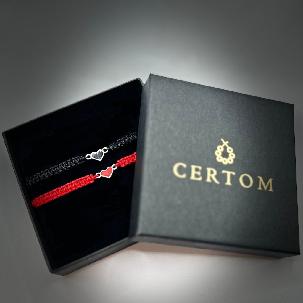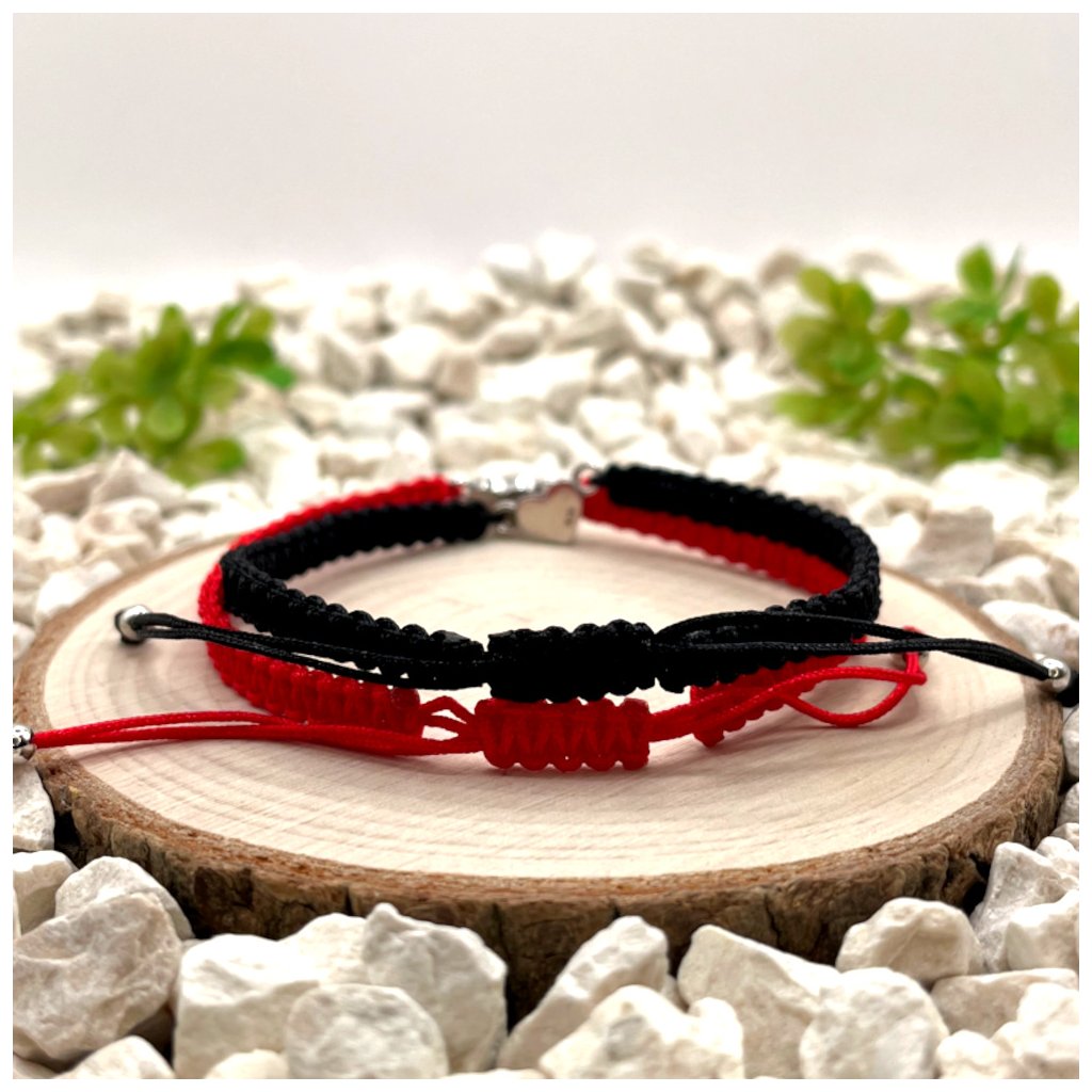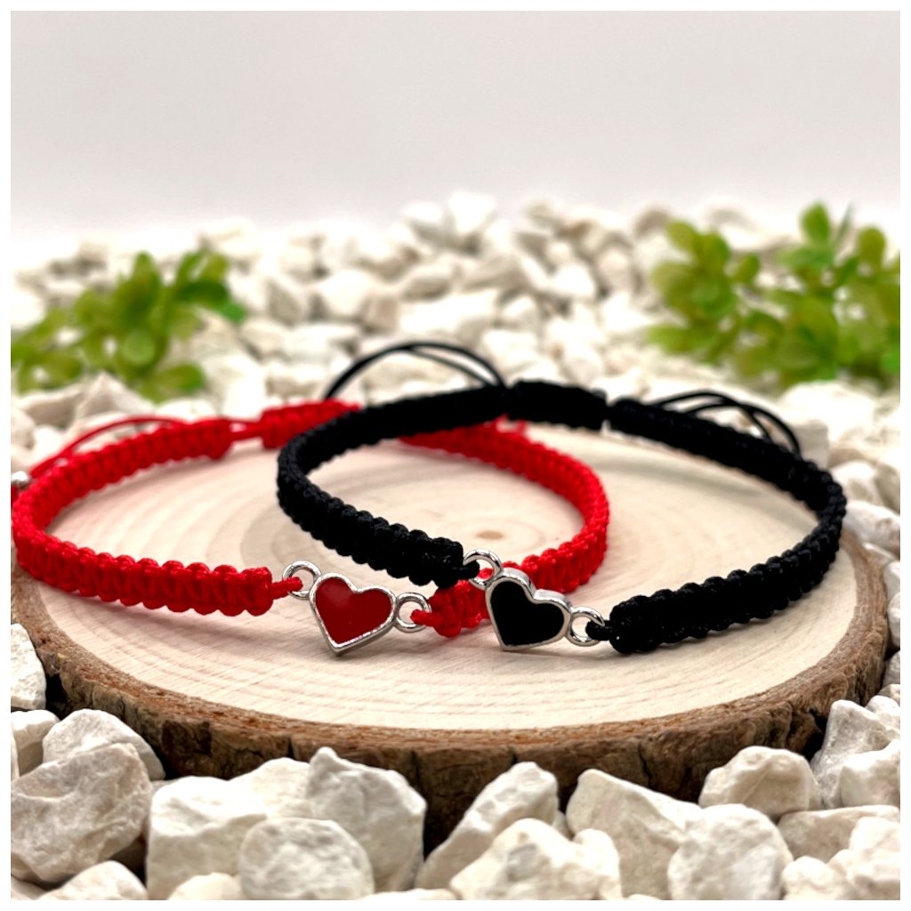 Párové macramé náramky se stříbrnými přívěsky srdce představují čistý a vyvážený design, který staví na kontrastu barev i materiálů. Černá nylonová šňůrka s černou pryskyřicí a červená nylonová šňůrka s červenou pryskyřicí vytvářejí dvě vizuálně propojené varianty, které dohromady působí harmonicky a symbolicky.