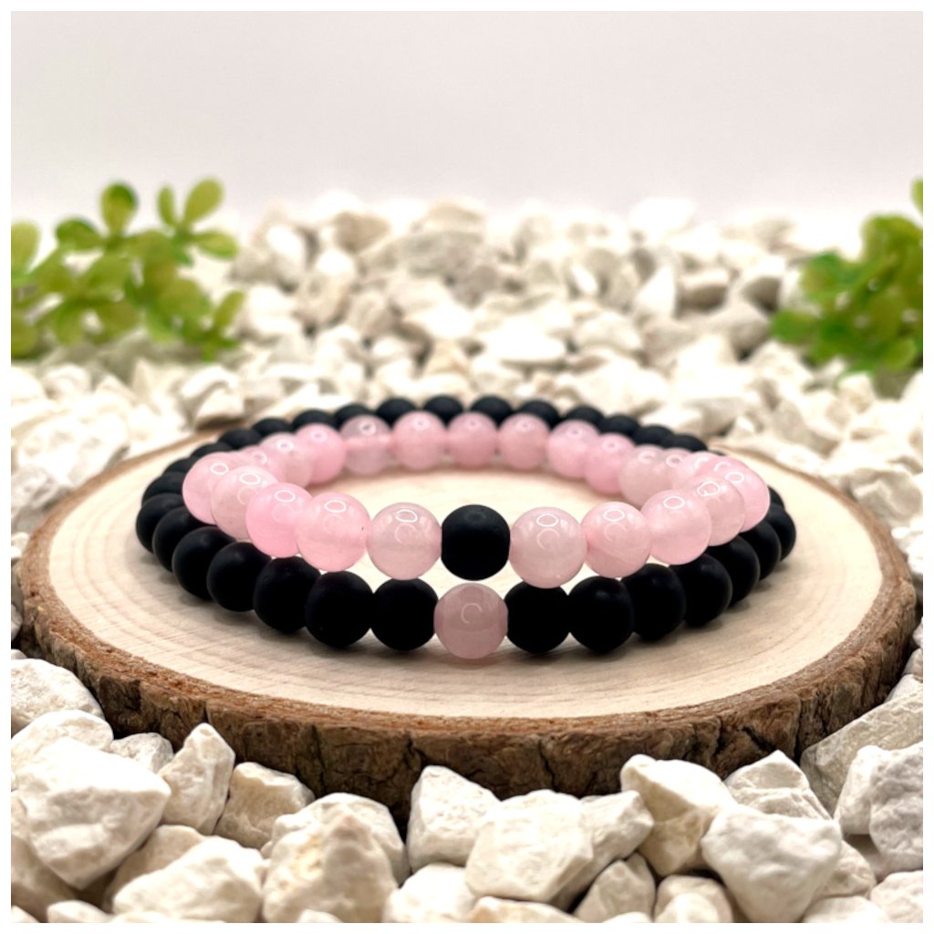 Tento set párových náramků je ručně vyroben z kombinace dvou energeticky silných minerálů – černého matného obsidiánu a růžového jadeitu Malaysia. Každý kámen je pečlivě vybrán a navlečen na elastomer, který zajišťuje pohodlné nošení i snadné nasazení bez zapínání.