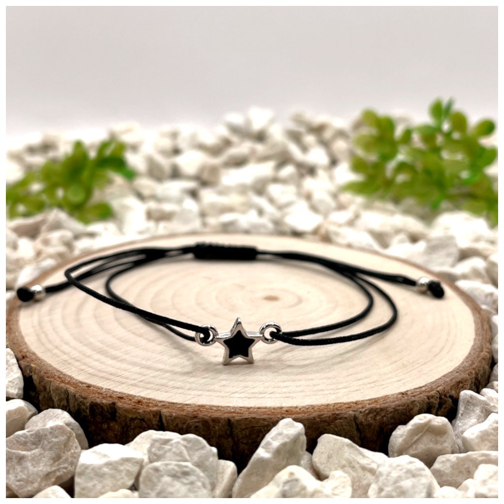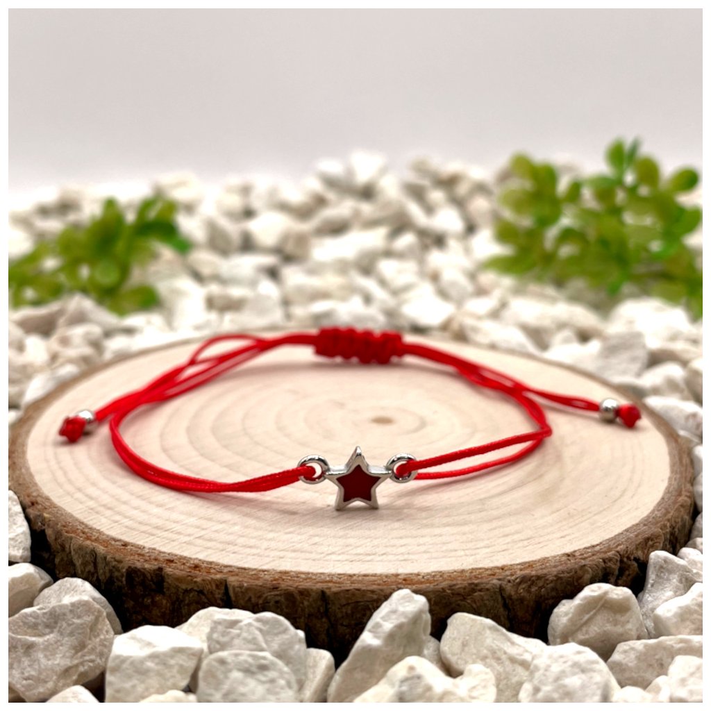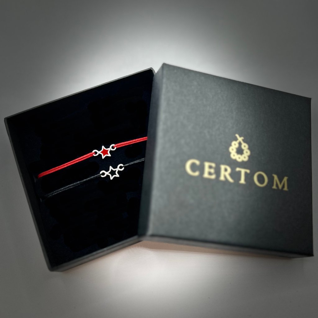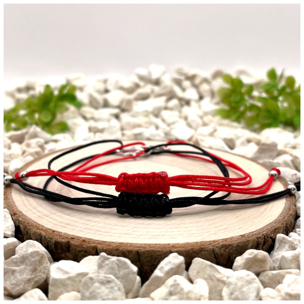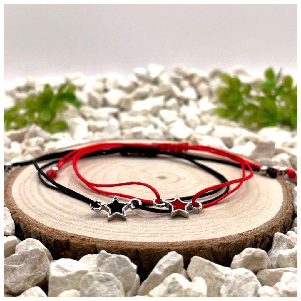 Párové provázkové náramky se stříbrnými přívěsky hvězdy vynikají čistým designem a kontrastním barevným řešením. Kombinace černého nylonu s hvězdou s černou pryskyřicí a červeného nylonu s hvězdou s červenou pryskyřicí vytváří dvě vzájemně doplňující se varianty, které spolu vizuálně i významově souzní.
