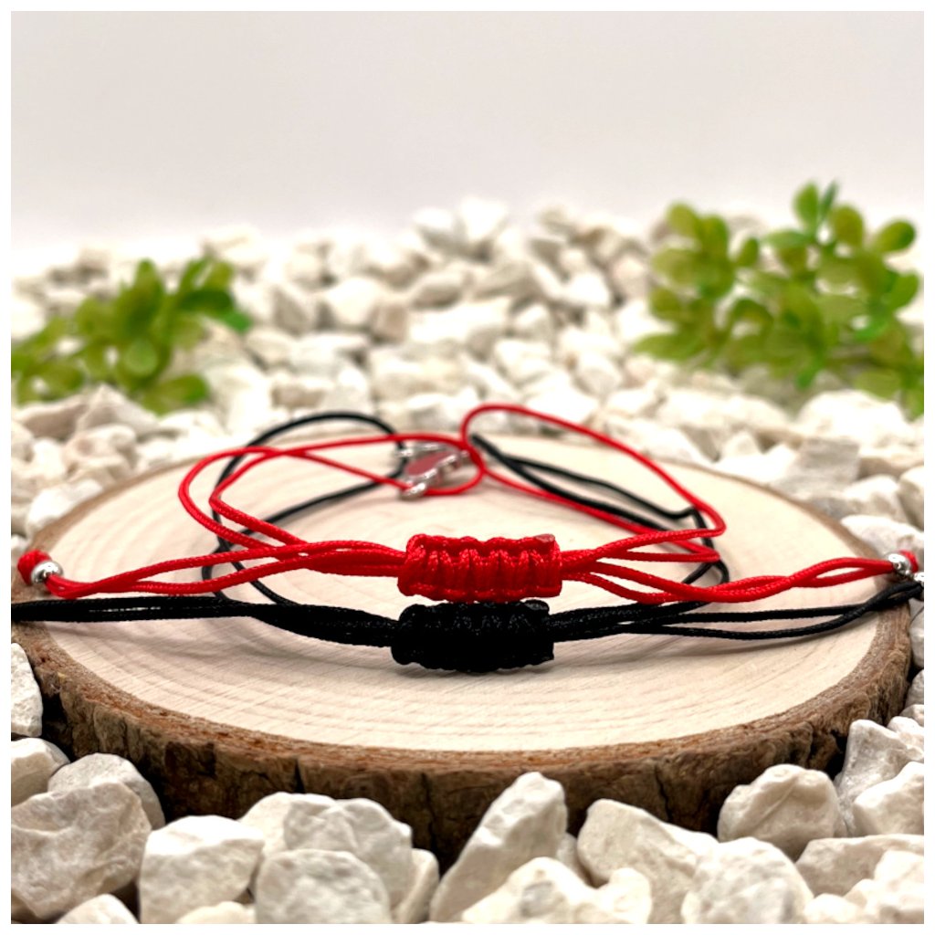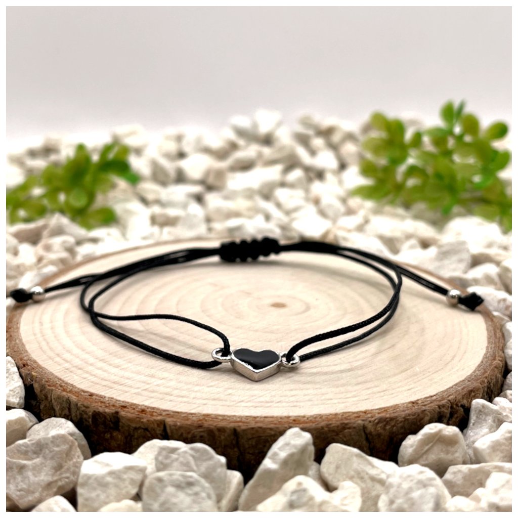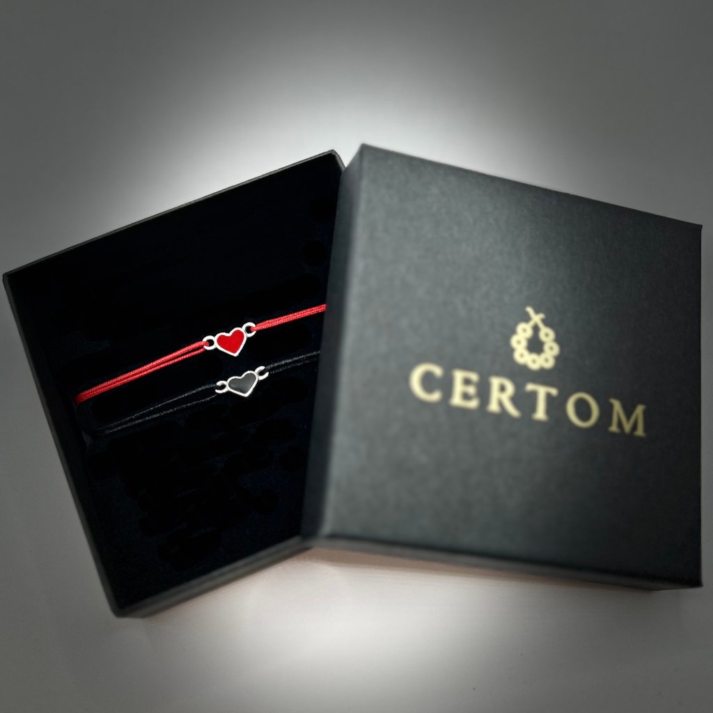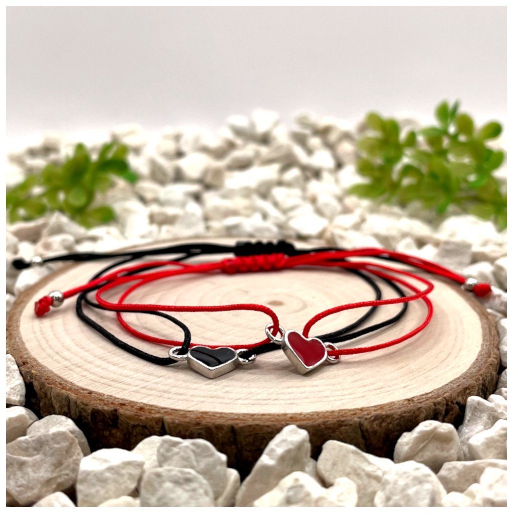 Párové provázkové náramky se stříbrnými přívěsky srdce vynikají čistým designem a jasným vizuálním sdělením. Kombinace černého nylonu se srdcem s černou pryskyřicí a červeného nylonu se srdcem s červenou pryskyřicí vytváří dvě vzájemně propojené varianty, které působí elegantně a současně osobně.
