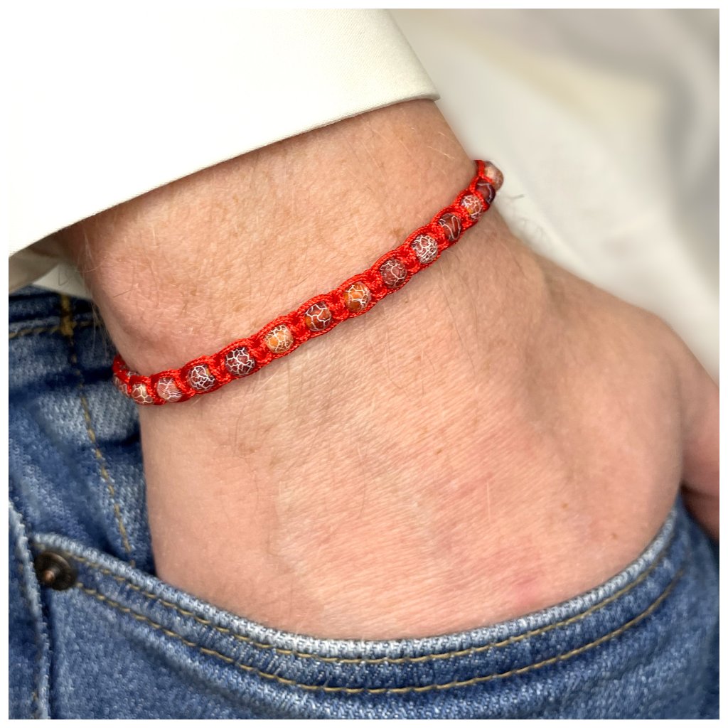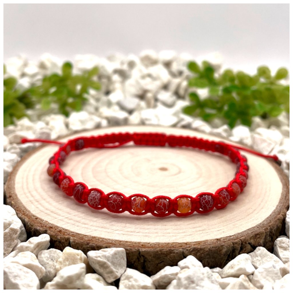 Tento pletený macramé náramek je tvořen matným červeným achátem o velikosti 4 mm a zapleten do červené nylonové šňůrky. Díky posuvnému uzlu lze délku snadno upravit v rozmezí 16,5–24,5 cm, což umožňuje pohodlné přizpůsobení různým velikostem zápěstí.