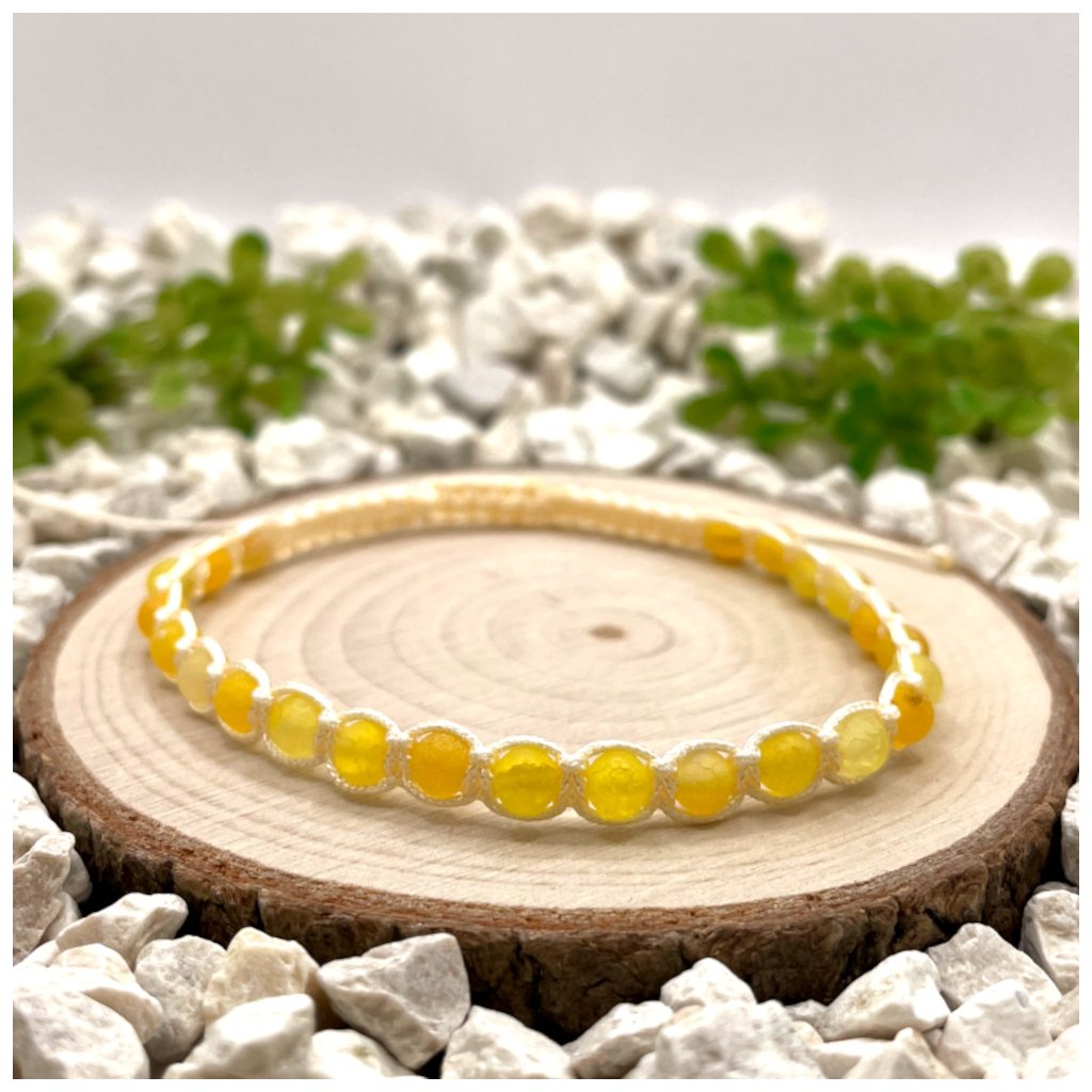 Pletený macramé náramek se žlutým achátem matným zaujme harmonickou kombinací drobných minerálních korálků a žlutého nylonového provedení. Korálky o velikosti 4 mm mají matný povrch, který působí klidně a přirozeně. Ručně vázaná technika macramé dodává náramku lehkou strukturu a zdůrazňuje precizní zpracování každého detailu.