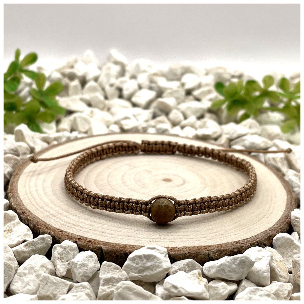 Jaspis obrázkový je přírodní kámen s charakteristickou kresbou připomínající přírodní scenérie. V kombinaci s macramé pletením vzniká doplněk, který působí přirozeně, klidně a zároveň originálně.