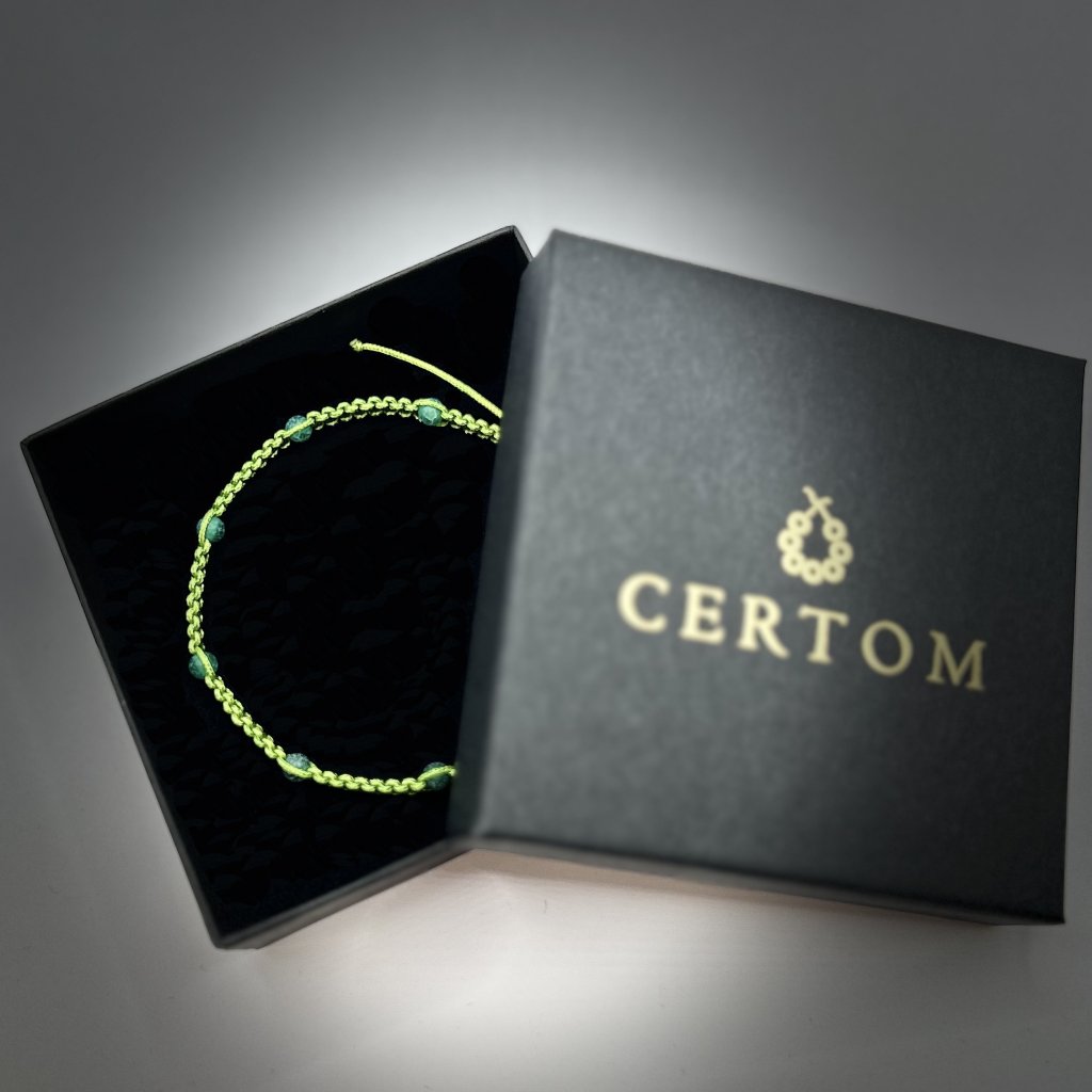 Zelený tón nylonové šňůrky se snadno kombinuje s neutrálními i přírodními barvami. Náramek lze nosit samostatně jako jemný detail nebo jej vrstvit s dalšími macramé či minerálními náramky.