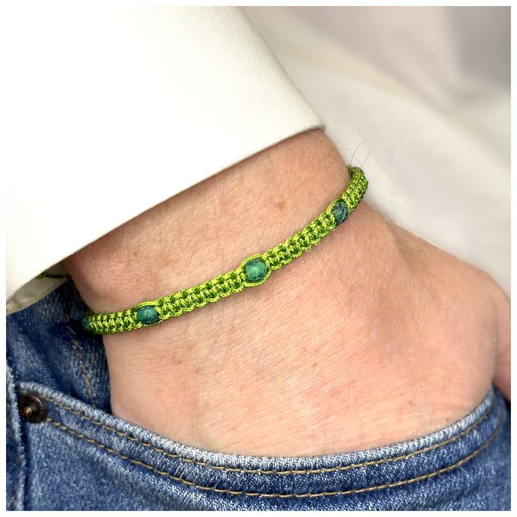 Tento pletený macramé náramek kombinuje zelenou nylonovou šňůrku s matným zeleným achátem o velikosti 4 mm. Díky posuvnému uzlu lze délku snadno upravit v rozmezí 17,5–25,5 cm, což zajišťuje pohodlné nošení pro různé velikosti zápěstí.