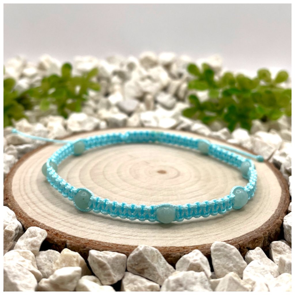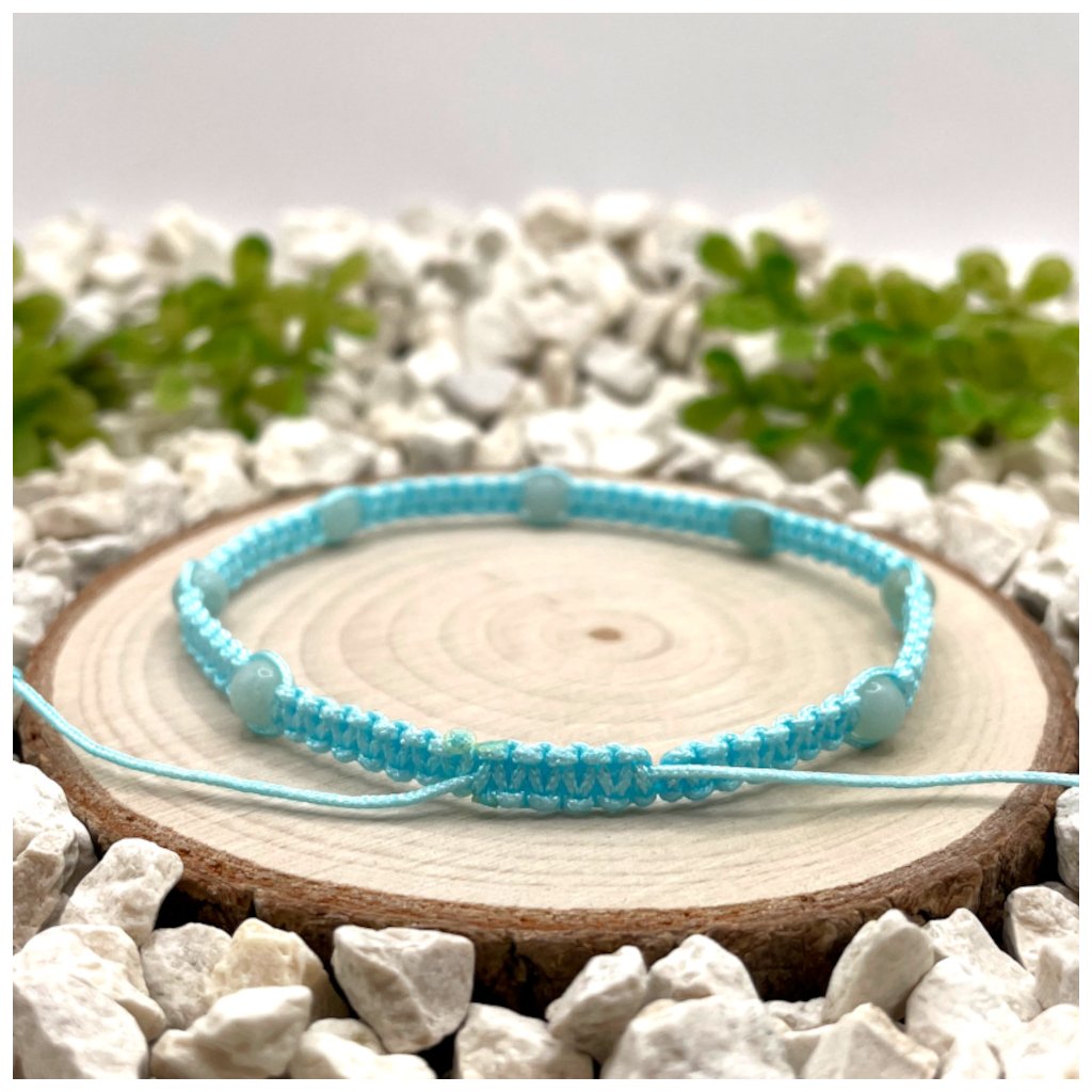 Tento pletený macramé náramek je tvořen amazonitem o velikosti 4 mm, který je ručně zapleten do modré nylonové šňůrky. Díky posuvnému uzlu lze délku pohodlně upravit v rozmezí 17,5–25,5 cm, což umožňuje snadné přizpůsobení různým velikostem zápěstí.