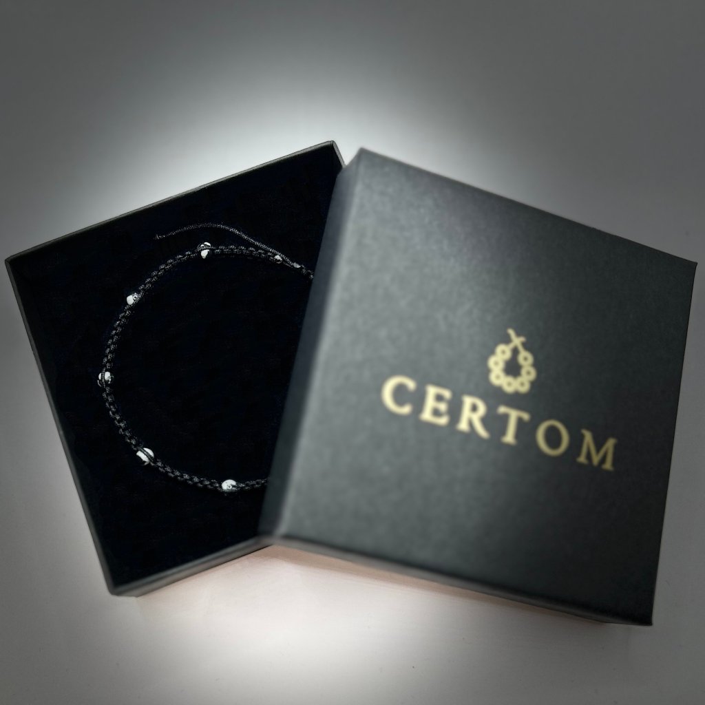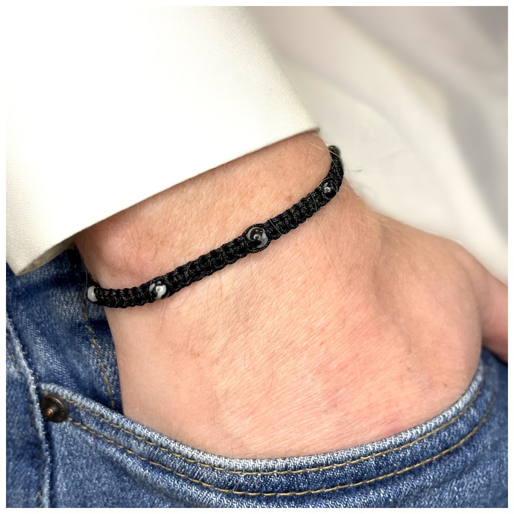 Tento pletený macramé náramek je tvořen obsidiánem vločkovým o velikosti 4 mm, který je zapleten do černé nylonové šňůrky. Díky posuvnému uzlu lze délku snadno upravit v rozmezí 17–25 cm, což zajišťuje pohodlné přizpůsobení různým velikostem zápěstí.