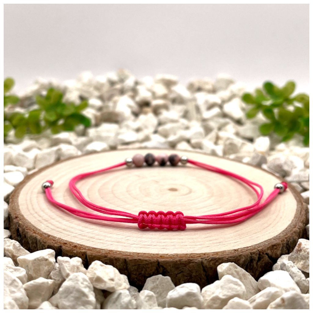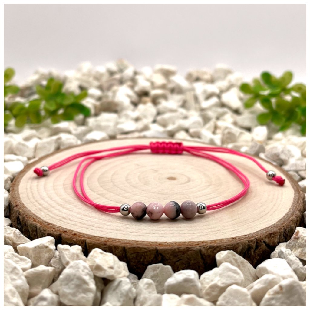 Tento ručně vyráběný náramek spojuje jemný růžový jaspis zebra (4 mm) s posuvným uzlem v růžové nylonové šňůrce. Jaspis zebra je kamenem rovnováhy a harmonie – pomáhá uvolnit stres, podporuje sebelásku a posiluje vnitřní klid.
