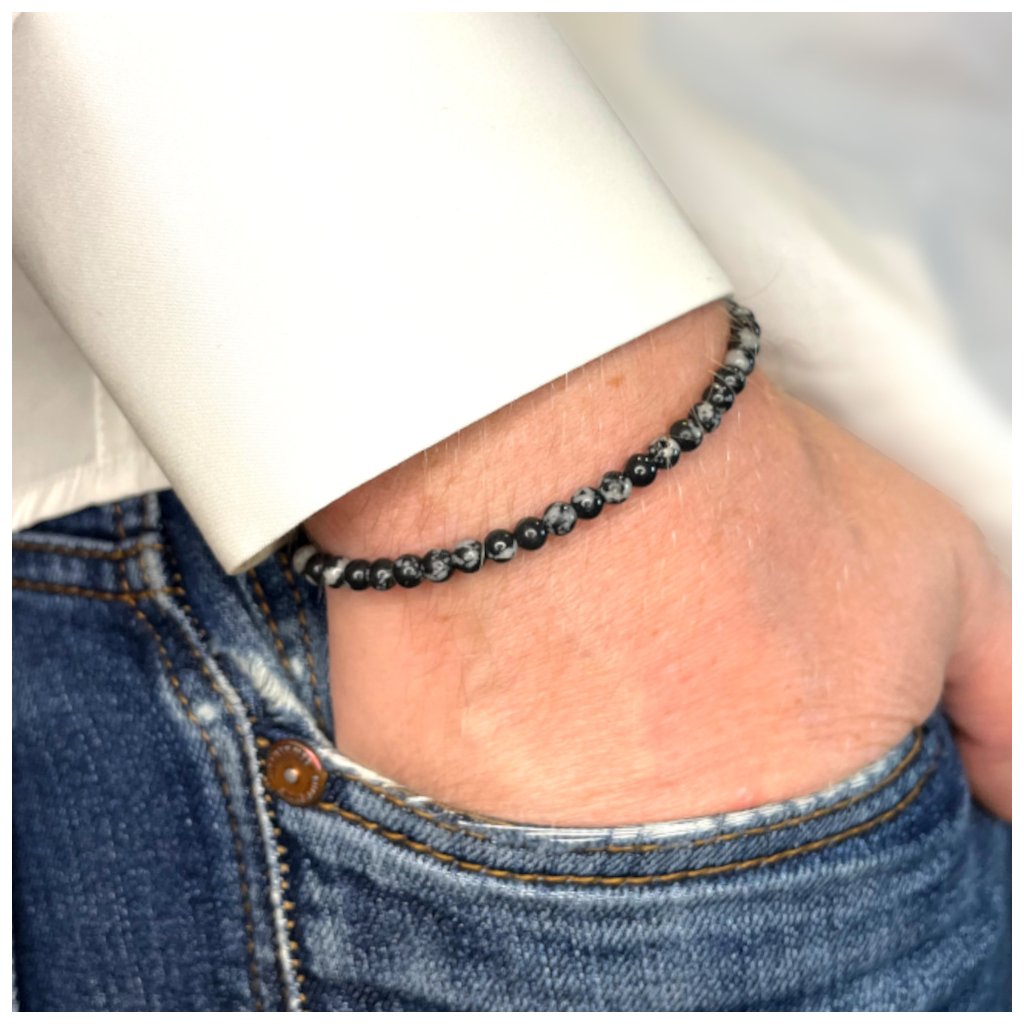 Náramek kombinuje drobné kuličky Obsidiánu vločkového (4 mm), známého svou černou barvou s bílými „vločkami“. Tento kámen je ceněný jako silný ochranný talisman a prostředek k emočnímu očištění.