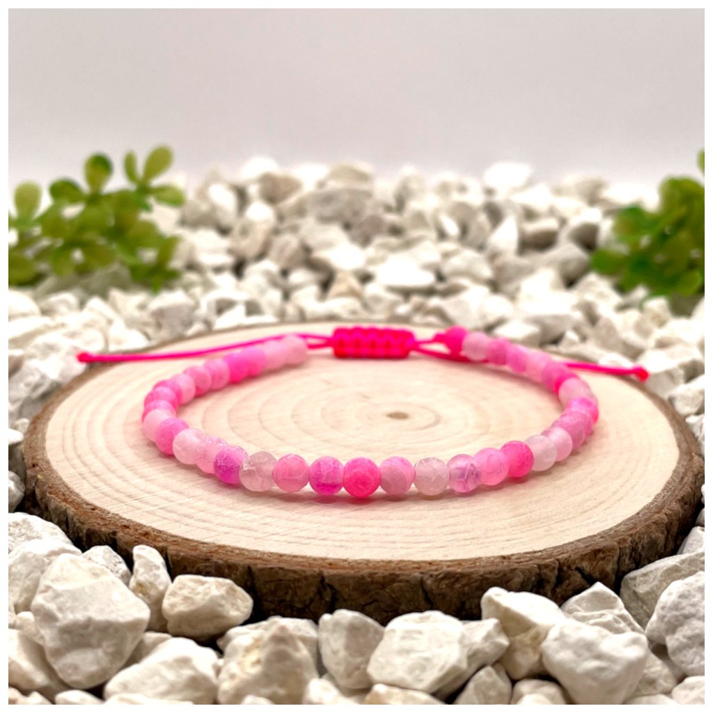 Tento ručně vázaný náramek kombinuje sílu achátu růžového matného (4 mm) s něžným vzhledem růžové nylonové šňůrky. Je ideálním doplňkem pro ženy, které hledají rovnováhu mezi vnitřní harmonií a ženskou elegancí.
