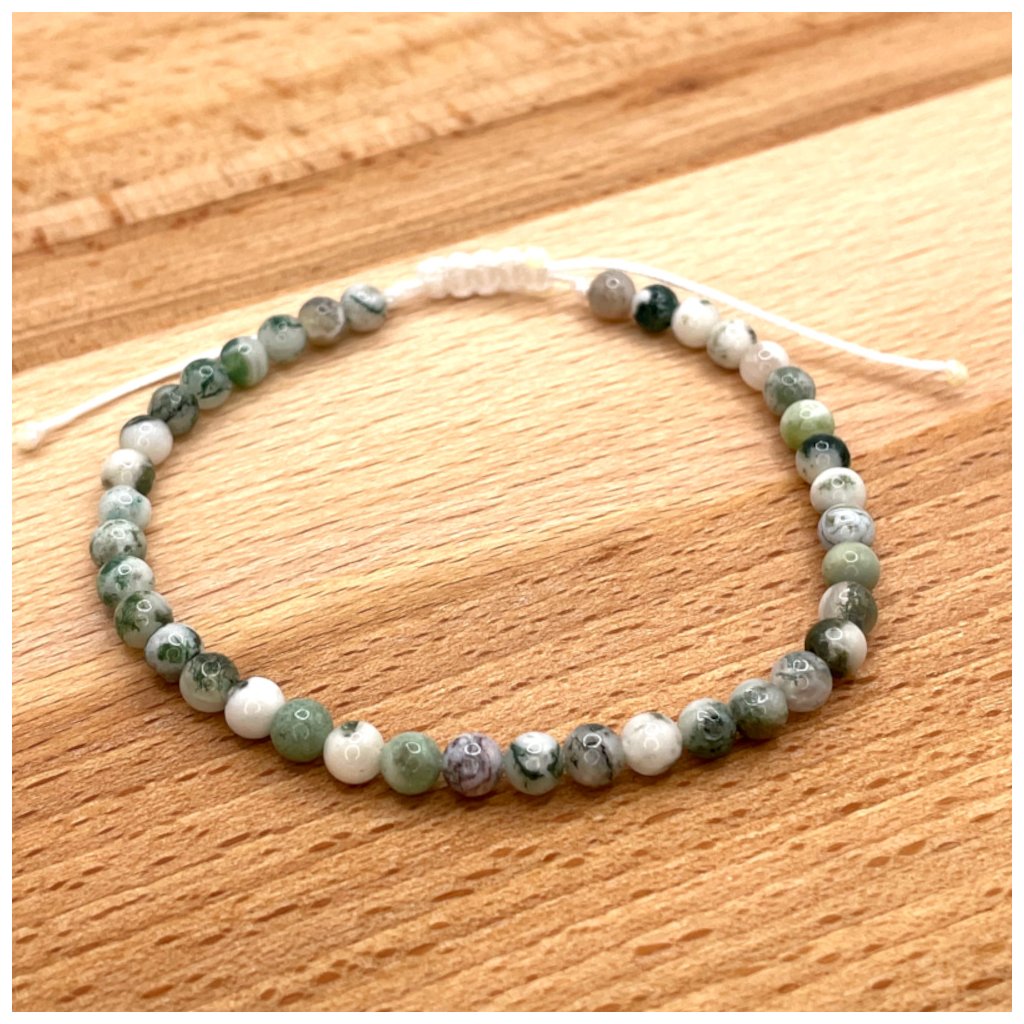 Provázkový náramek s achátem stromečkovým vyniká jednoduchým designem, který staví na kontrastu bílé nylonové šňůrky a jemně kresleného minerálu. Korálky o velikosti 4–5 mm mají charakteristický přírodní vzhled připomínající strukturu větví nebo krajiny, díky čemuž působí náramek přirozeně a nenápadně elegantně.