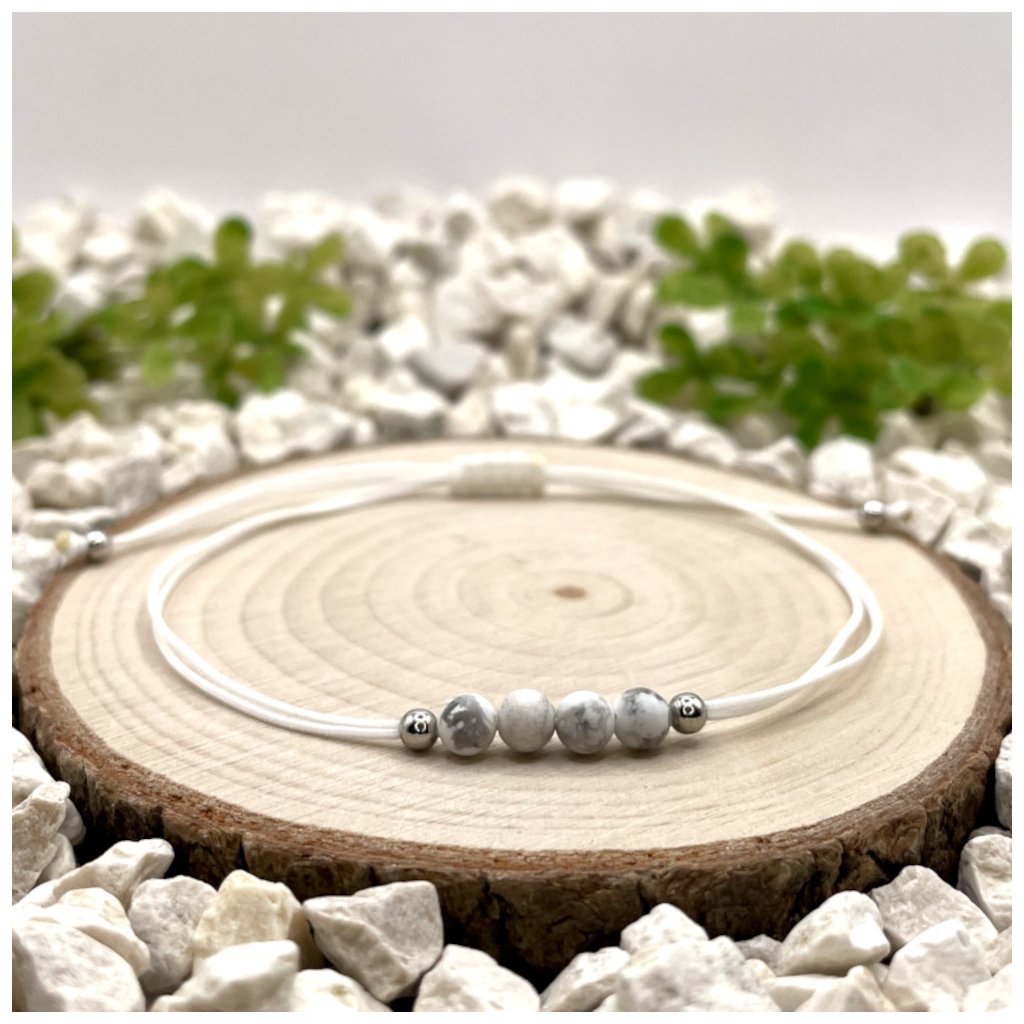 Provázkový náramek je tvořen matným magnezitem o velikosti 4 mm, doplněným stříbrnými prvky ze stříbra Ag925 s rhodiovou povrchovou úpravou. Bílá nylonová šňůrka vytváří čisté a elegantní barevné ladění, které působí lehce a moderně.