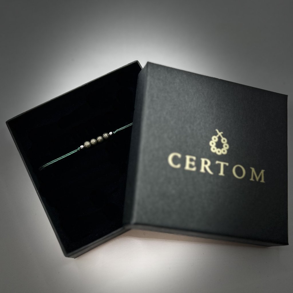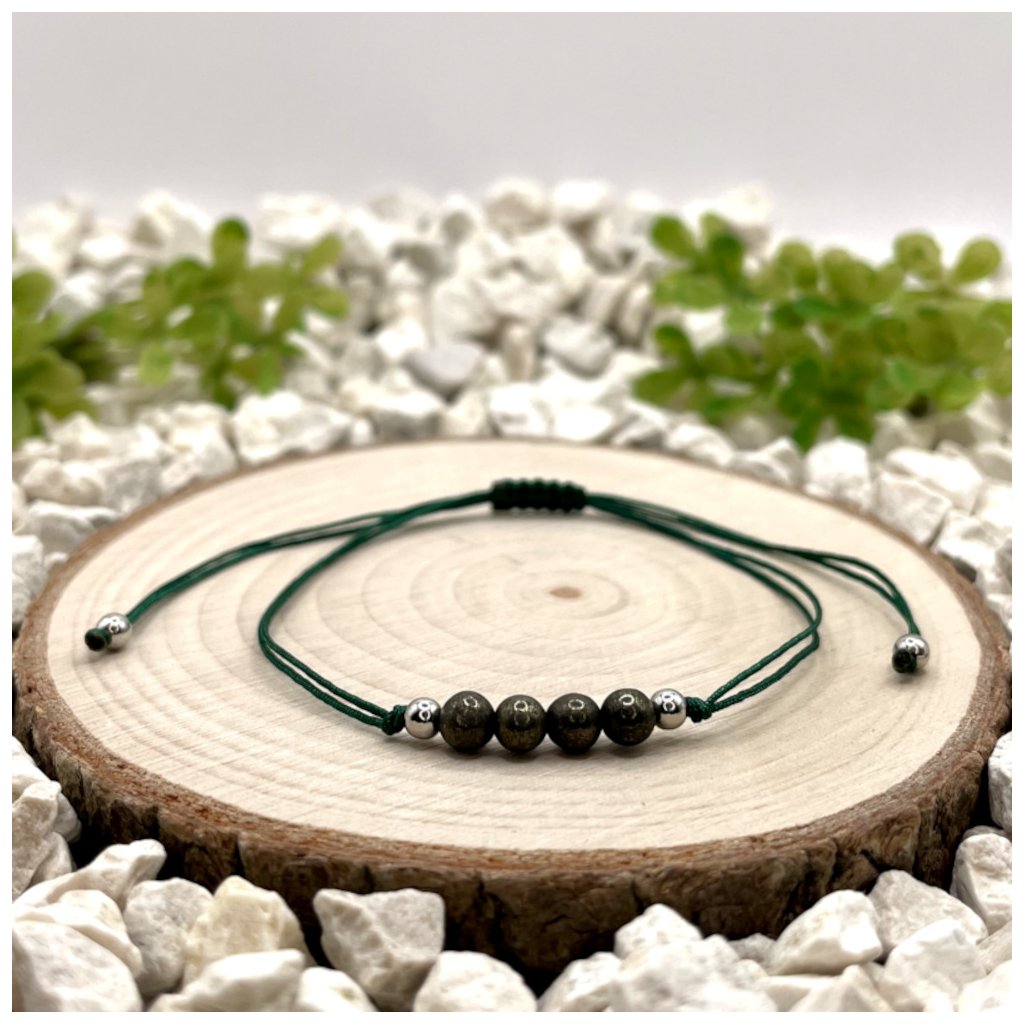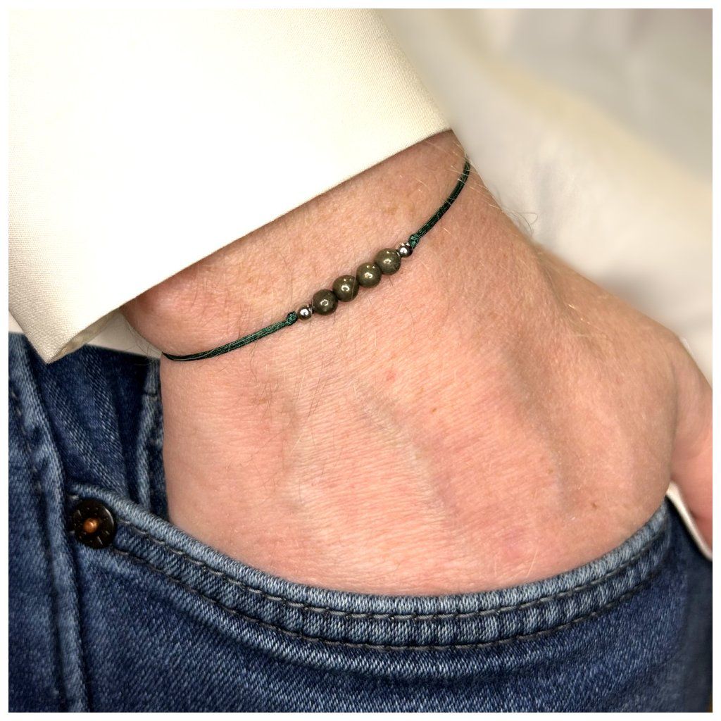 Provázkový náramek je tvořen pyritem o velikosti 4 mm, doplněným stříbrnými prvky ze stříbra Ag925 s rhodiovou povrchovou úpravou pro vyšší odolnost a dlouhotrvající lesk. Zelená nylonová šňůrka podtrhuje přírodní charakter šperku a vytváří zajímavý kontrast s kovovým odleskem minerálu.