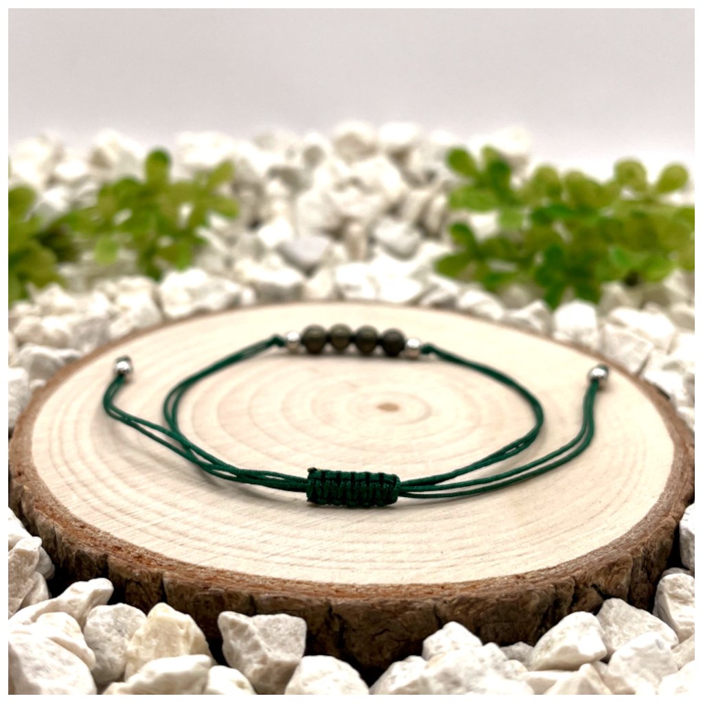 Zelená nylonová šňůrka se snadno kombinuje s neutrálními i tmavšími odstíny oblečení. Náramek lze nosit samostatně jako kontrastní detail nebo jej vrstvit s dalšími provázkovými či minerálními náramky pro osobitější vzhled.