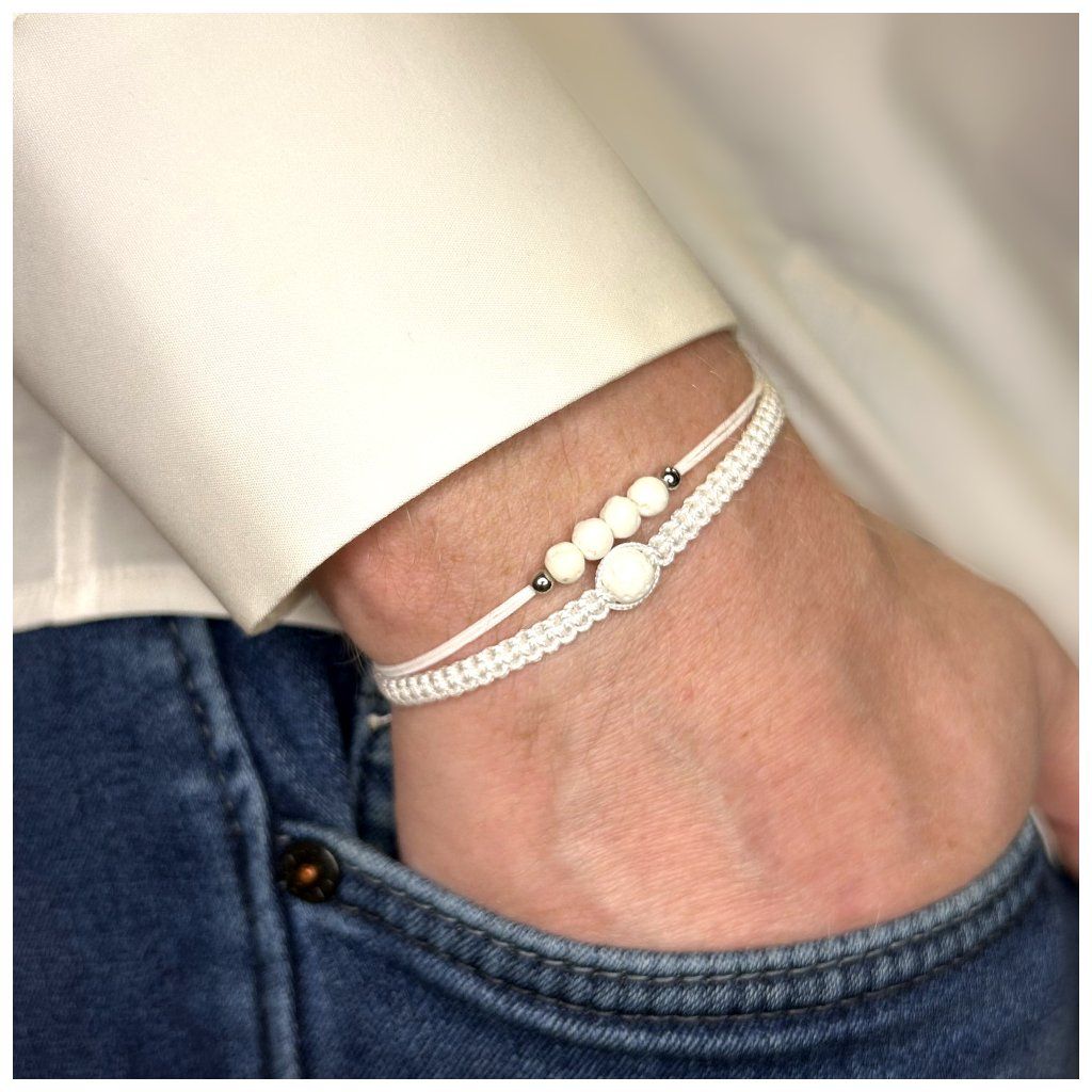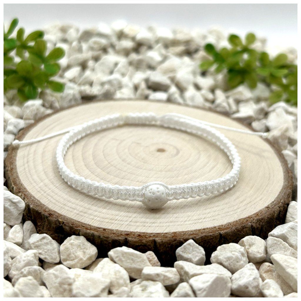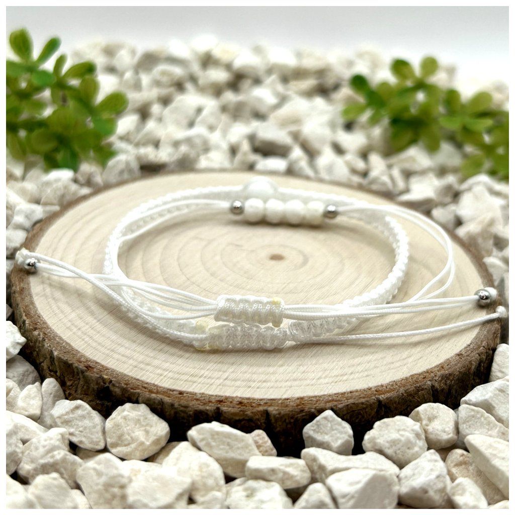 Set náramků s bílou lávou: provázkový a macramé v čistém světlém stylu