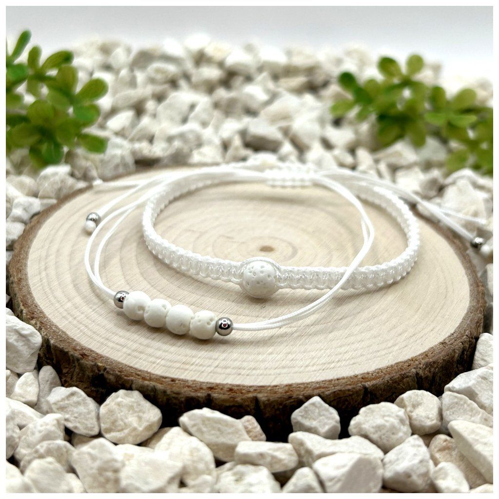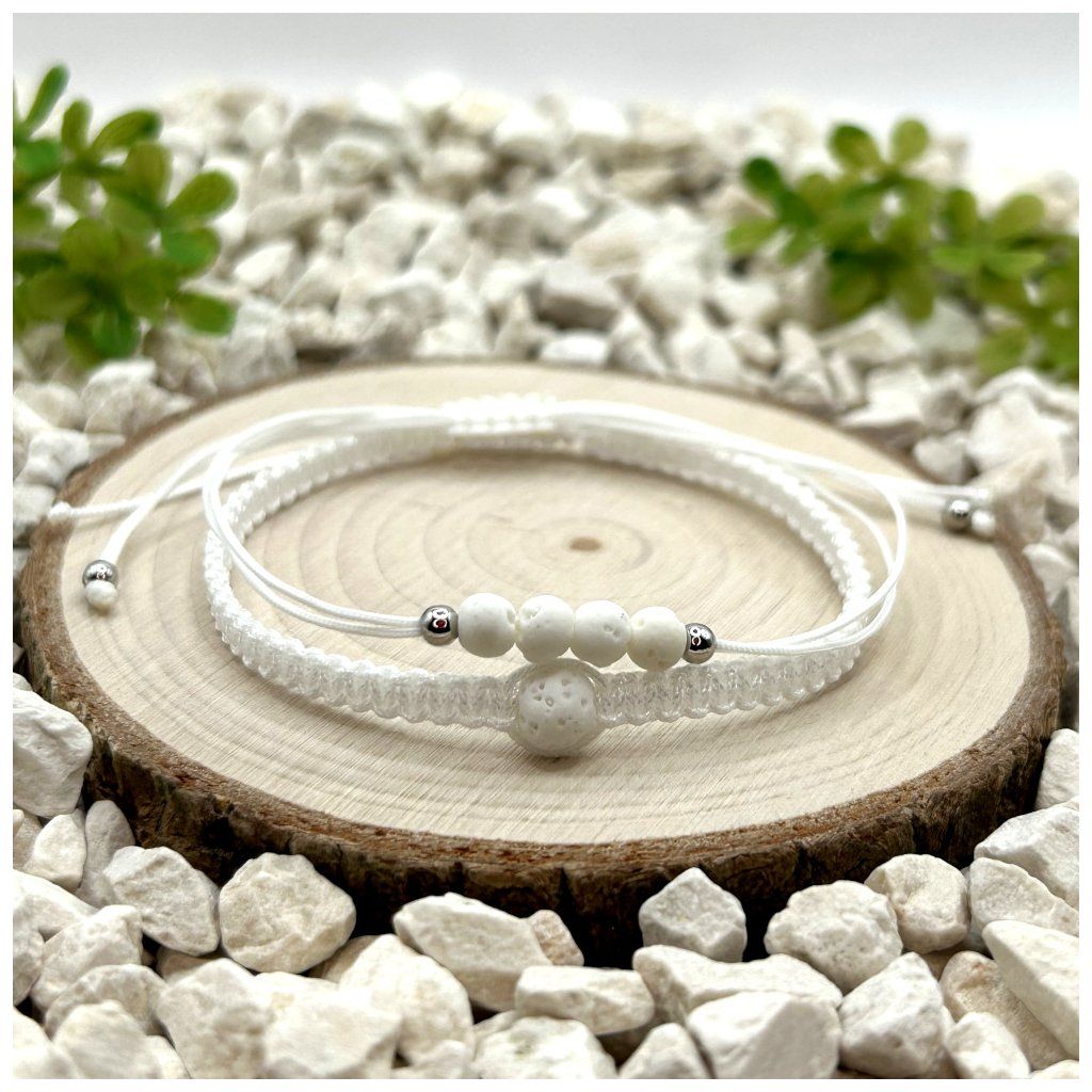 Tento set náramků kombinuje dva odlišné styly – klasický provázkový náramek a macramé náramek – které propojuje světlé barevné ladění a přírodní láva v bílé variantě. Výsledkem je doplněk, který působí lehce, čistě a elegantně.