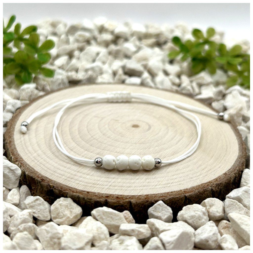 Bílá nylonová šňůrka vytváří jemný základ, zatímco strukturovaný povrch lávy dodává náramkům přirozený charakter. Kovové detaily ze stříbra Ag925 přidávají decentní lesk a podtrhují celkový vzhled.