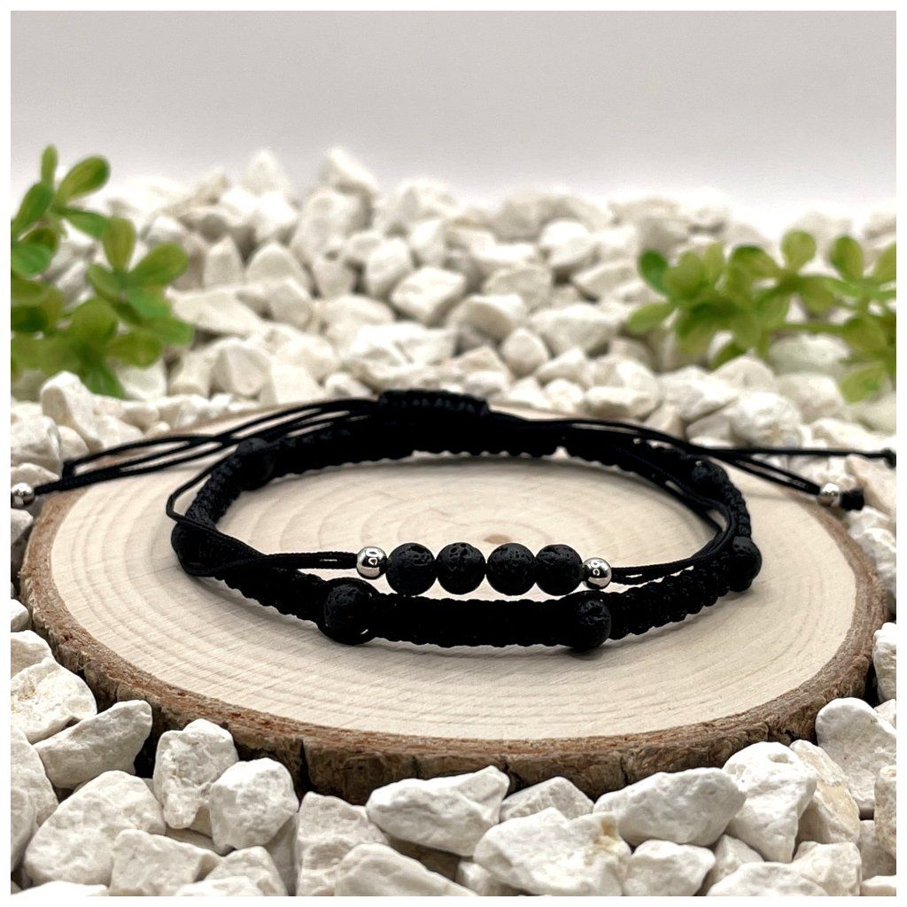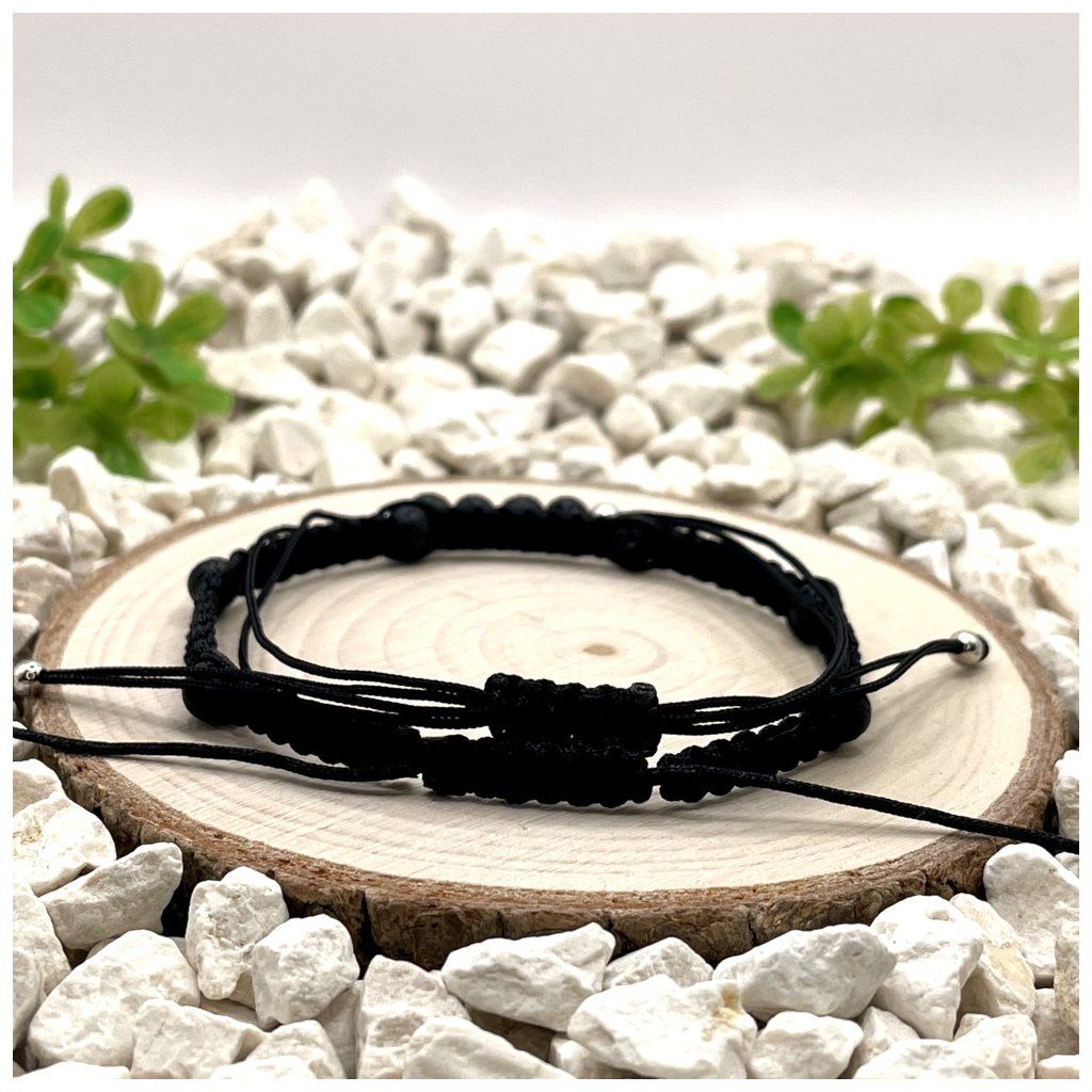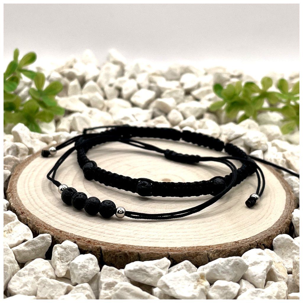 Set tvoří macramé náramek a provázkový náramek, které jsou doplněny o minerální korálky lávy černé o velikosti 4 mm a stříbrné prvky ze stříbra Ag925 s rhodiovanou úpravou. Náramky jsou zpracovány v černém nylonovém provedení a doplněny posuvným uzlem, díky kterému lze délku pohodlně upravit v rozmezí 16,5 cm - 24,5 cm. Díky tomu se snadno přizpůsobí zápěstí a jsou vhodné pro každodenní nošení.