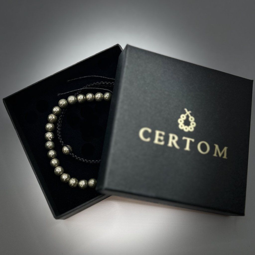 - Pyrit – v tradiční symbolice bývá spojován se sebevědomím a odhodláním. Zaujme svým charakteristickým kovově zlatým leskem a výraznou strukturou, která působí energicky a moderně. Skvěle vynikne v pánských i unisex kombinacích a dobře ladí s černou, tmavě modrou i koženými doplňky.