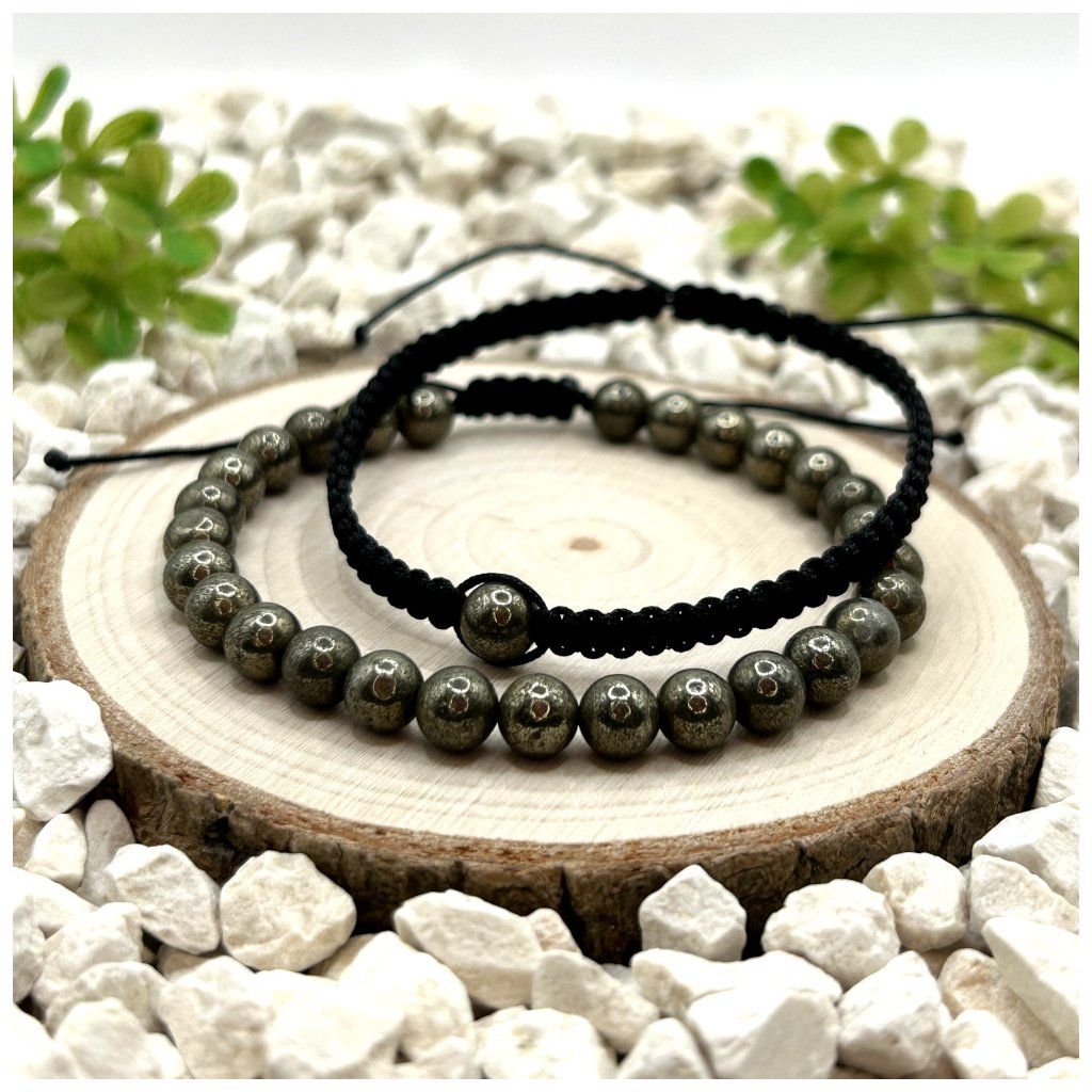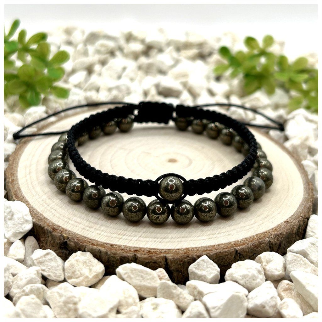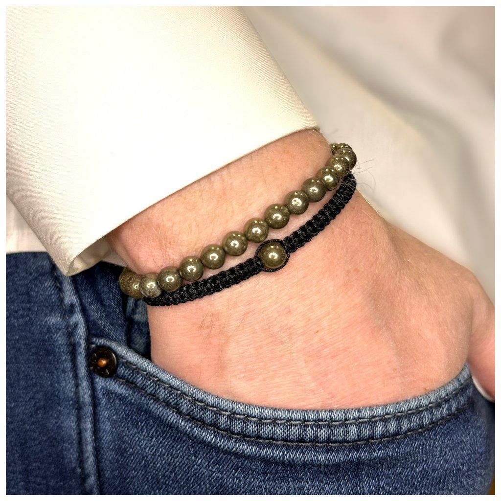 Set náramků s pyritem spojuje dva rozdílné styly – klasický provázkový náramek a macramé náramek – které propojuje černé barevné ladění a minerál pyrit o velikosti 6 mm. Výsledkem je doplněk, který působí moderně, čistě a snadno se kombinuje s různými styly.