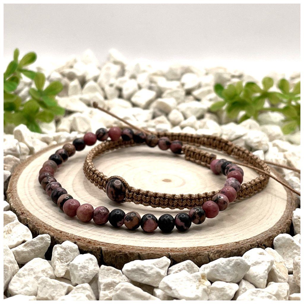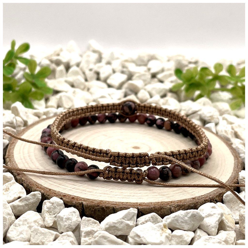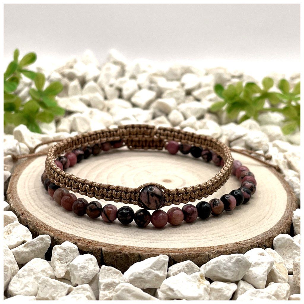 Set tvoří macramé náramek a provázkový náramek, které jsou doplněny o korálky rodonitu o velikosti 6 mm a 4 mm. Náramky jsou zpracovány v hnědém nylonovém provedení a doplněny posuvným uzlem, díky kterému lze délku pohodlně upravit v rozmezí 17 cm - 25 cm. Díky tomu se snadno přizpůsobí zápěstí a jsou vhodné pro každodenní nošení.