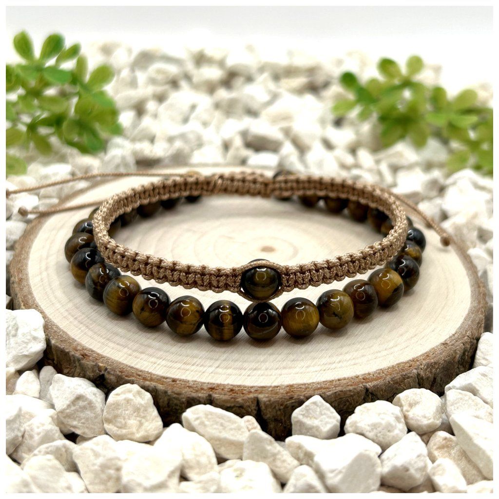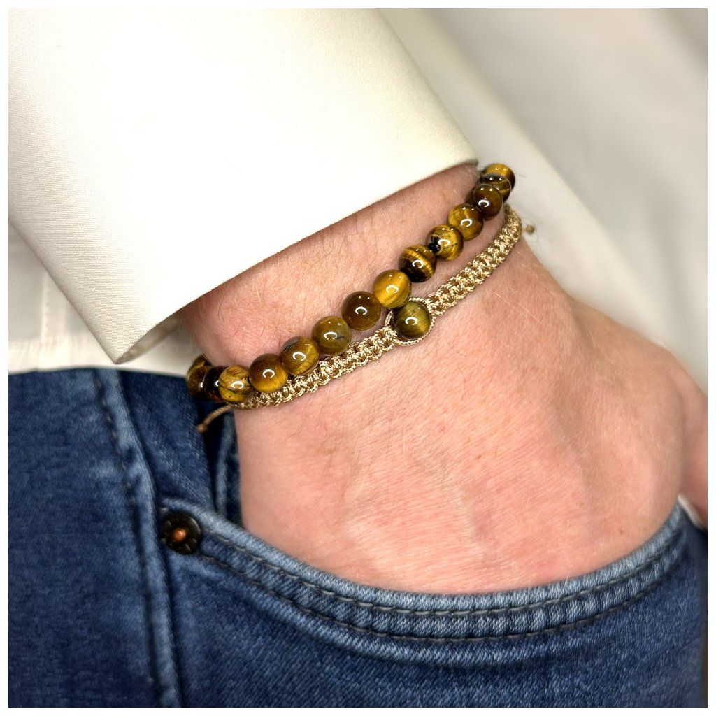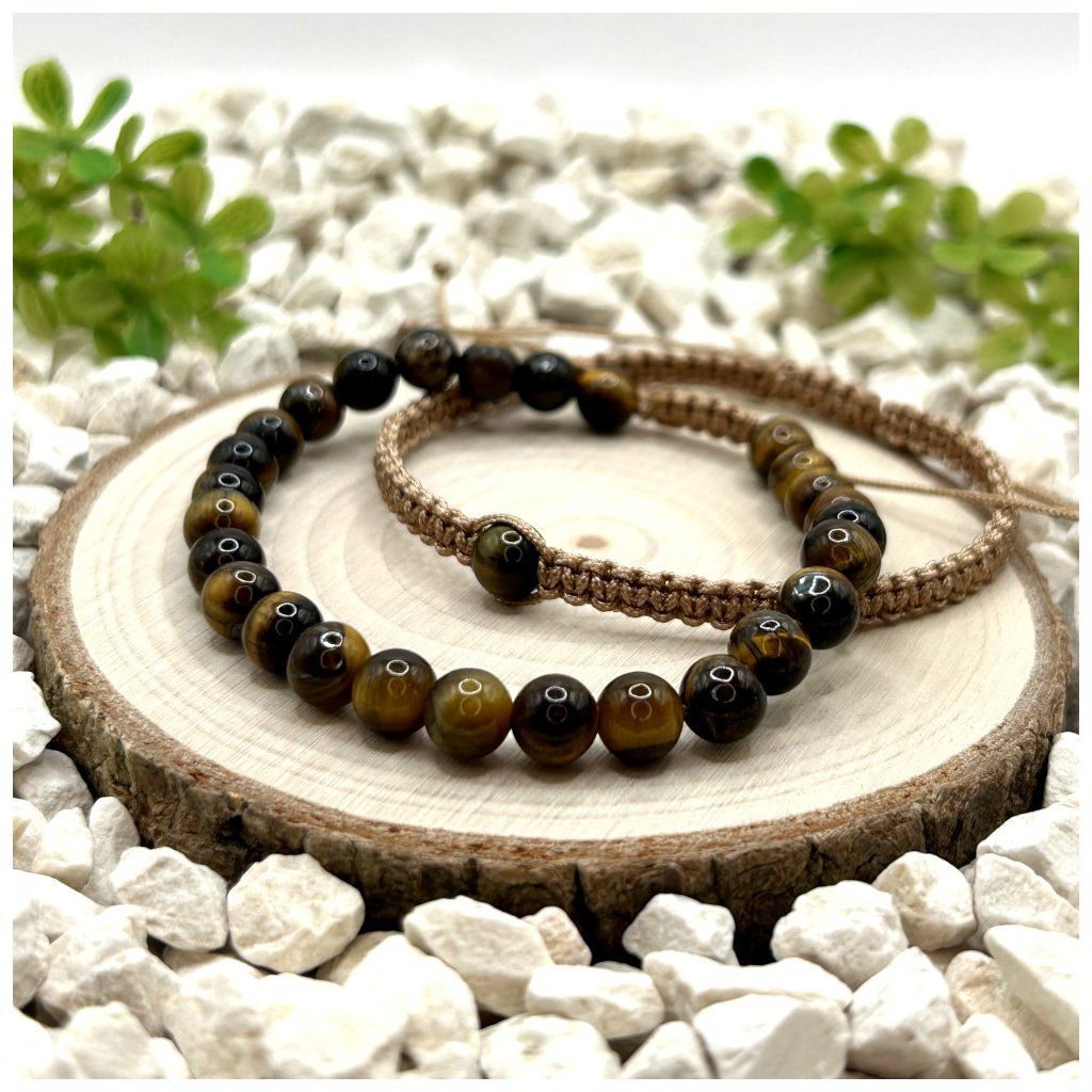Set náramků s tygřím okem kombinuje dva rozdílné styly – klasický provázkový náramek a macramé náramek – které spojuje jednotné barevné ladění a minerál tygří oko o velikosti 6 mm. Výsledkem je doplněk, který působí přirozeně, výrazně a zároveň se snadno kombinuje s každodenním outfitem.